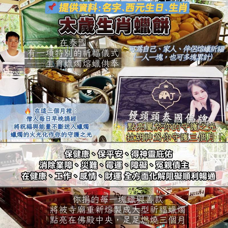 提供 姓名+西元生日+生肖 蠟塊和善款被用來製作成更大的祈福成願蠟燭,製作好的蠟燭將在寺廟里點滿三個月之久,捐一次一共為你燒蠟3個月、僧人早晚誦經祈福,經過如此時長的祈福,幫助捐此蠟燭的善信:可保健康,保平安,得神靈庇佑,消業障,消災難,消霉運,消障礙,消冤情債主,剋太歲,剋火年。