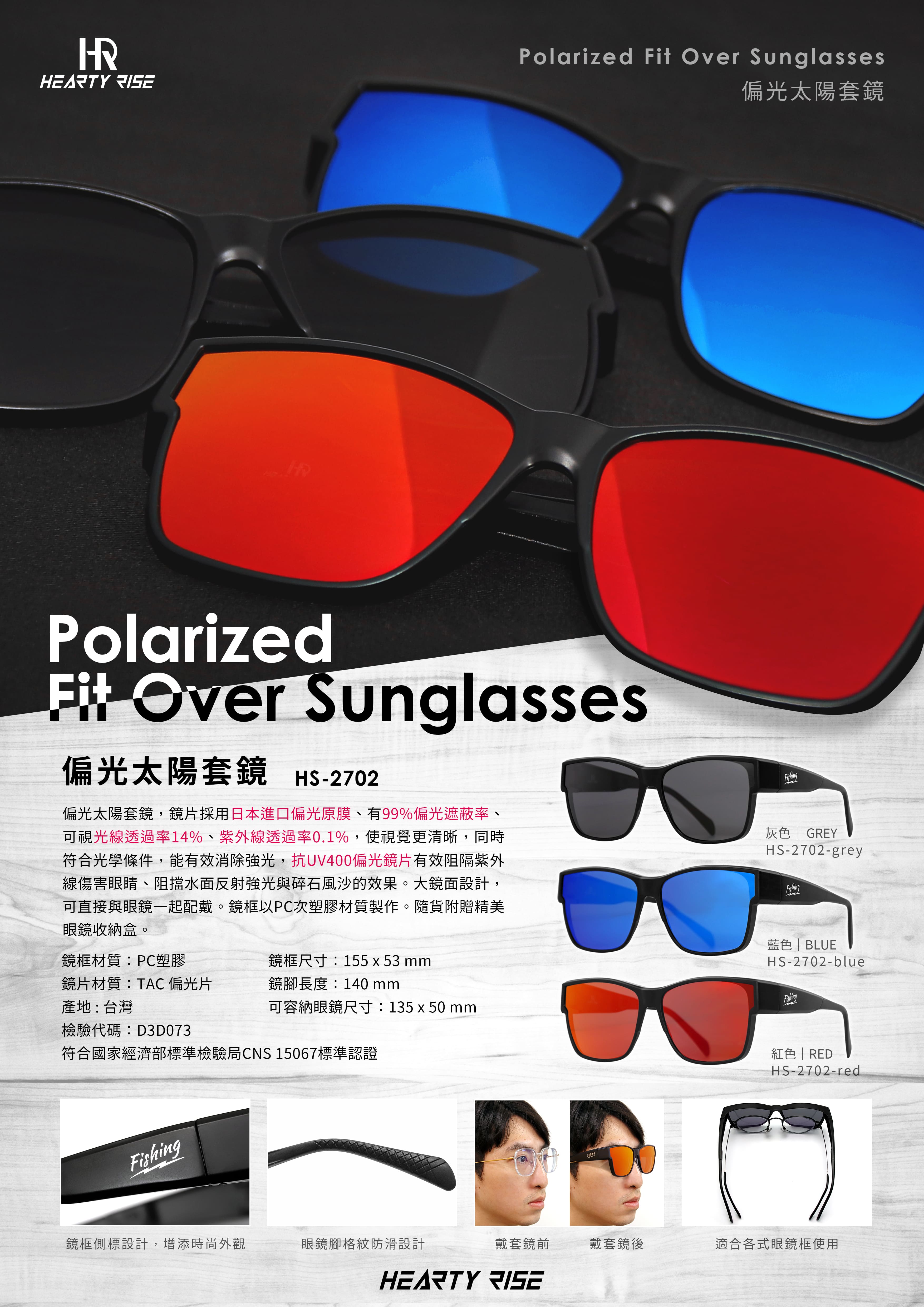 偏光太陽套鏡,鏡片採用日本進口偏光原膜、有99%偏光遮蔽率、可視光線透過率14%、紫外線透過率0.1%,使視覺更清晰,同時符合光學條件,能有效消除強光,抗UV400偏光鏡片有效阻隔紫外線傷害眼睛、阻擋水面反射強光與碎石風沙的效果。大鏡面設計,可直接與眼鏡一起配戴。鏡框以PC塑膠材質製作。隨貨附贈精美眼鏡收納盒。