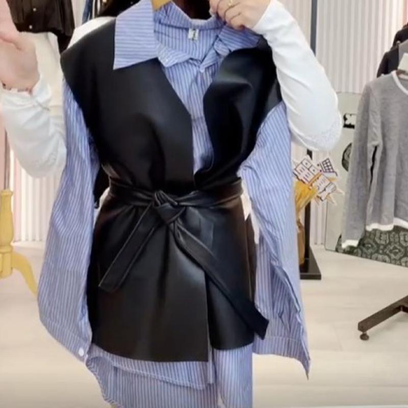 A420 - 條紋質感藍襯皮革背心套裝(附腰帶)