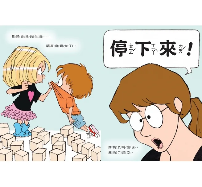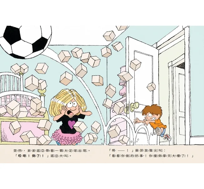 蘇菲堆了一座積木城堡,正高興想找媽媽來看時,弟弟卻突然衝進來,搞砸她的傑作!