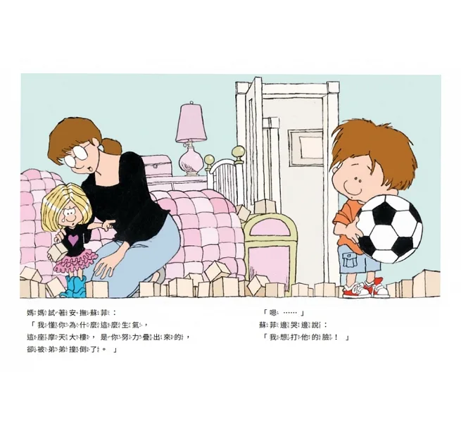 蘇菲氣得伸出拳頭想打弟弟,媽媽同理她難過的情緒後,陪她一起思考:生氣時,可以怎麼做?