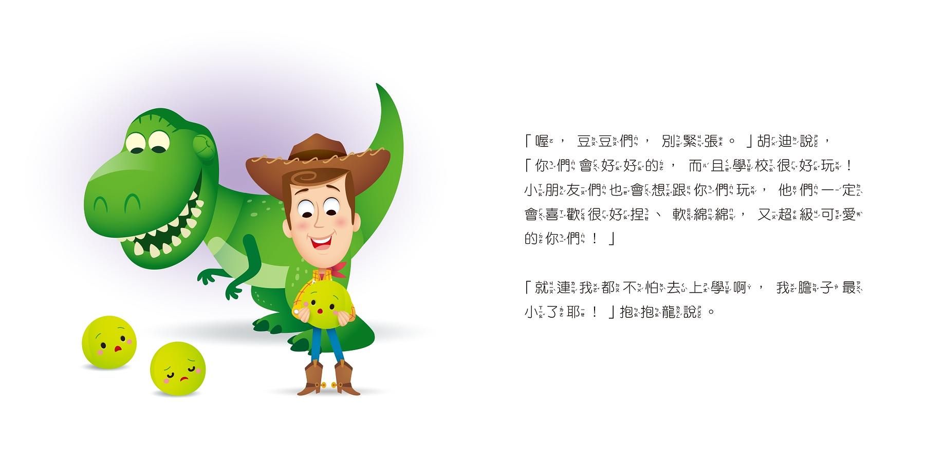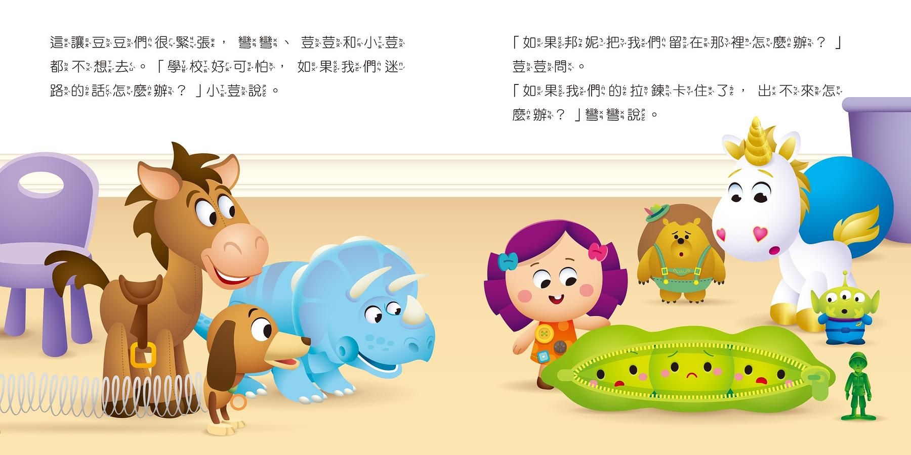 藉由胡迪與三小豆上學的一天,帶孩子認識學校生活與幼兒園的生活常規,例如將書包放好、玩玩具時排隊輪流、故事時間安靜聆聽,以及如何與同學相處互動。玩具總動員電影裡大受歡迎的抱抱龍、士兵、火爆史巴克,也會在故事中登場,學校最好玩有趣的地方,就是會有好多同學和你一起玩!