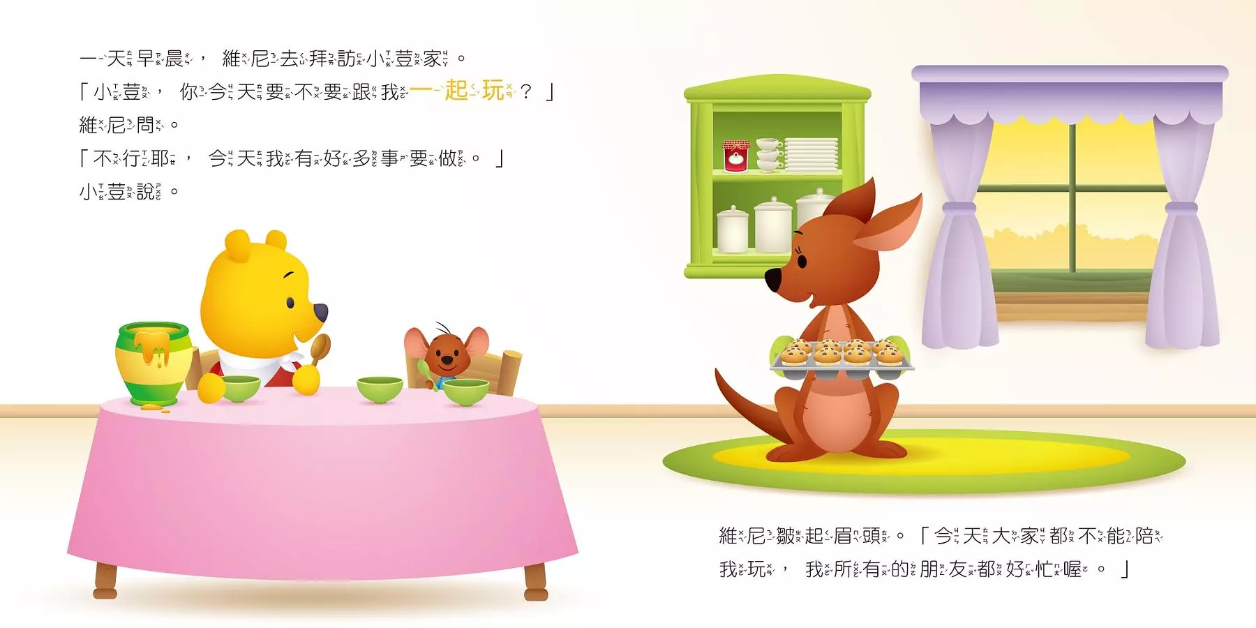 交朋友是孩子社會化必經的階段,藉由小熊維尼和朋友的對話,帶孩子思考簡單又富有深意的問題,怎樣才能交到新朋友呢?其實每個人都有自己不同的方式喔!跟著樂於分享的小熊維尼,一起走進暖心的友誼故事,鼓勵孩子伸出友善的手,與他人建立真誠友誼。