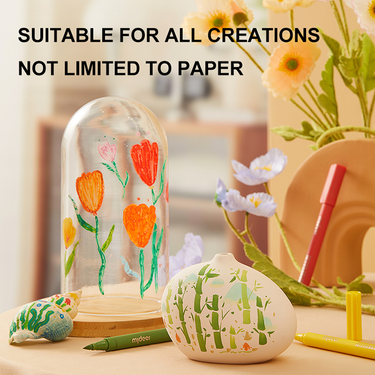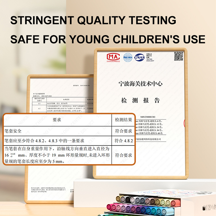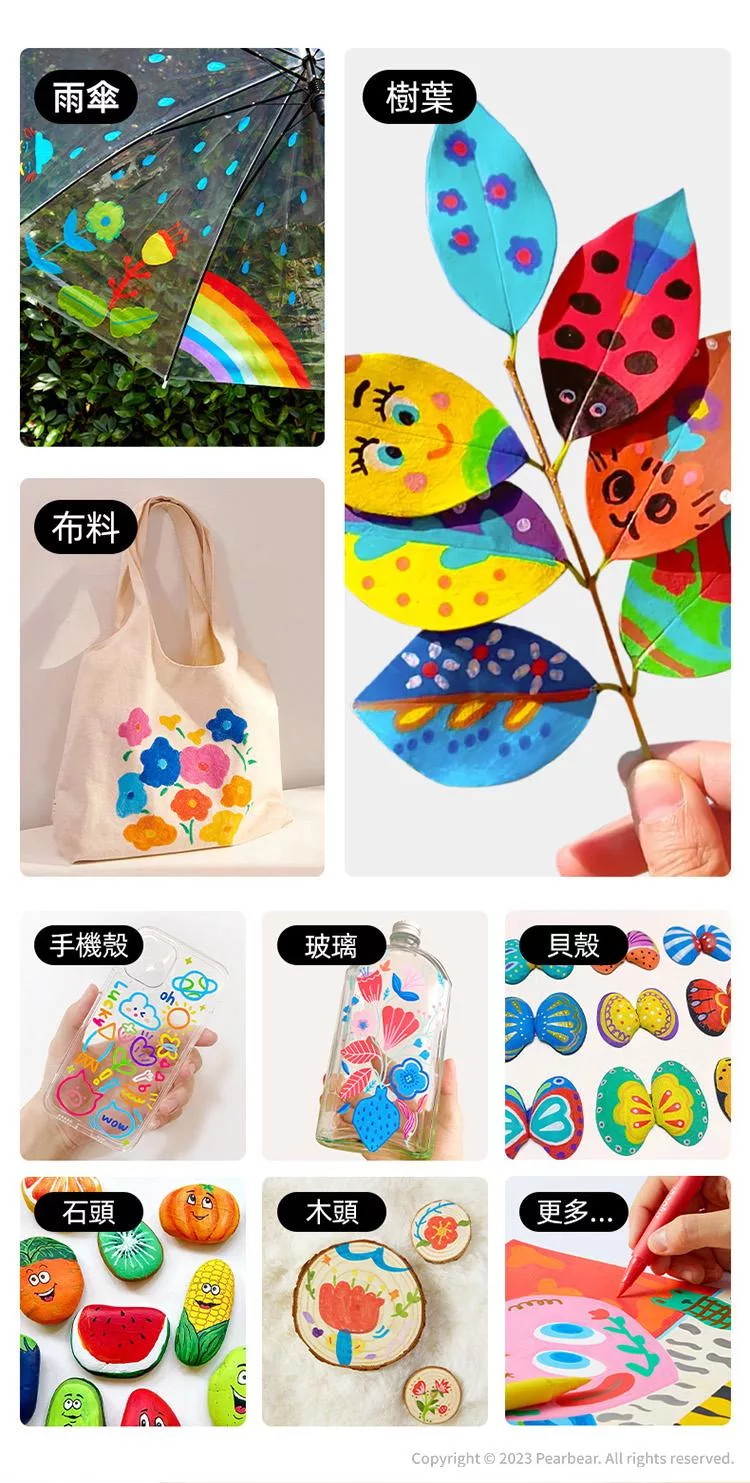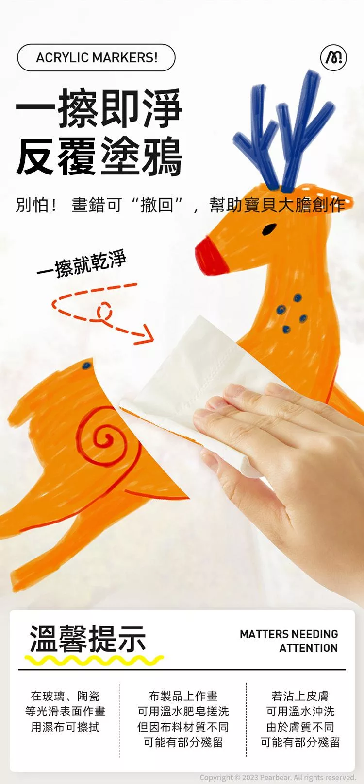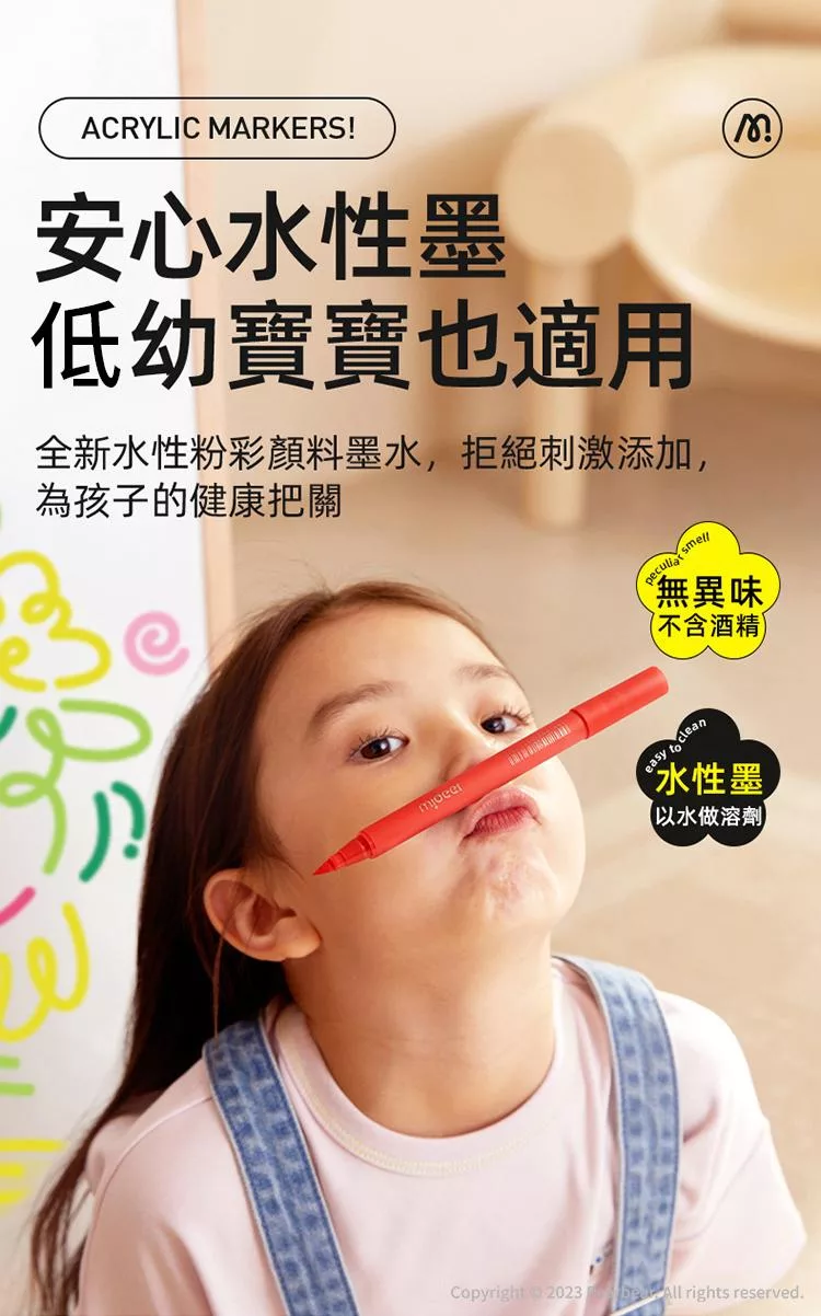 只需輕觸即可繪製,無需用力,使繪畫更靈活,上色效果更出色,容易疊加顏色。可輕鬆繪製在任何物體,具有強大的覆蓋能力。採用拉動式包裝,方便攜帶收納。刷毛式軟頭讓畫作流暢,可以根據用力程度,繪製不同粗細的線條,提供更強的操作感受,無限擴展創作可能性。可畫出粗線條、描繪輪廓,也可以輕輕勾勒細線條。打開蓋子即可開始創作。棉芯式墨水儲存設計,輕觸即可繪畫,墨水流暢均勻適中。這款筆不僅適用於紙張,還可在其它光滑表面使用。採用安全水性墨水,非常適合每個階段孩子使用,低齡初學也適用。全新的水性粉彩顏料墨水不含刺激添加劑,能保護孩子健康,無異味不含酒精,採用水為溶劑,輕擦即可清潔,可重複繪畫,一擦即乾淨。在玻璃、陶瓷等光滑表面上作畫時,可用濕布擦拭。在布製品上作畫時,可用溫水和肥皂洗滌。但由於不同材質的原因,可能有些殘留。若不慎塗在皮膚上,可用溫水沖洗,因個人膚質不同,可能會有些殘留。色彩鮮豔明亮,並提供獨特的金屬色供選擇。無論何時何地,都能保持鮮豔的色彩,顏色覆蓋力強,飽和度高,易於疊加上色,且乾得很快,不易暈染。高品質墨水,解決了臟兮兮的問題,乾得快且不弄髒小手。孩子最佳的色彩啟蒙。