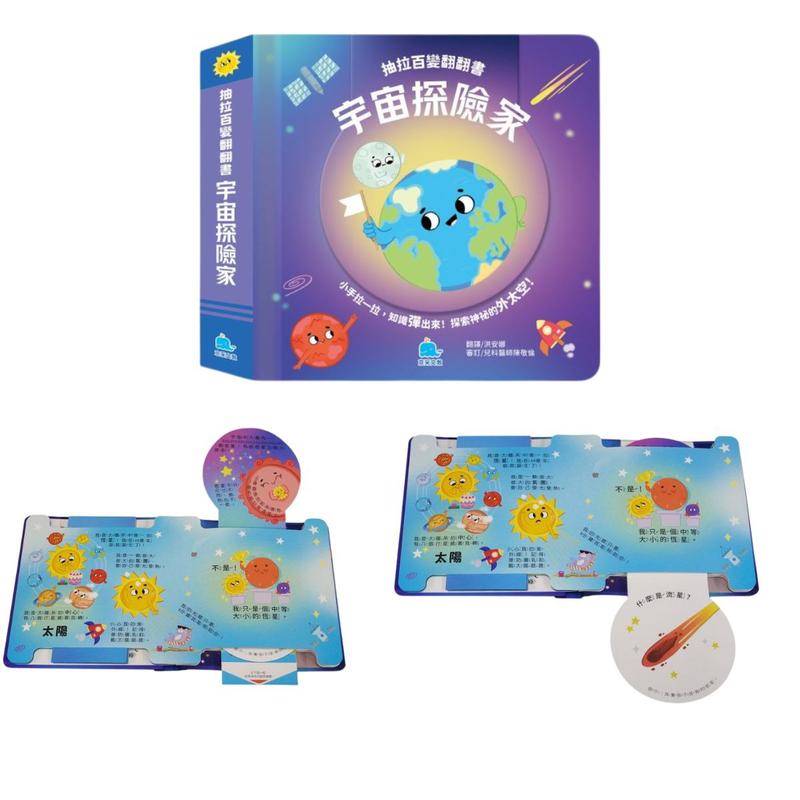 獨創的抽拉機關,帶給孩子獨一無二的驚喜──先思考關於宇宙的知識提問,再輕輕往下拉,新的頁面就會彈出來揭曉答案,幫助孩子認識恆星、八大行星、太陽系、銀河系等知識。這種全新的互動式閱讀,不僅讓孩子更專注,還能培養探索精神,讓學習變得更加有趣!