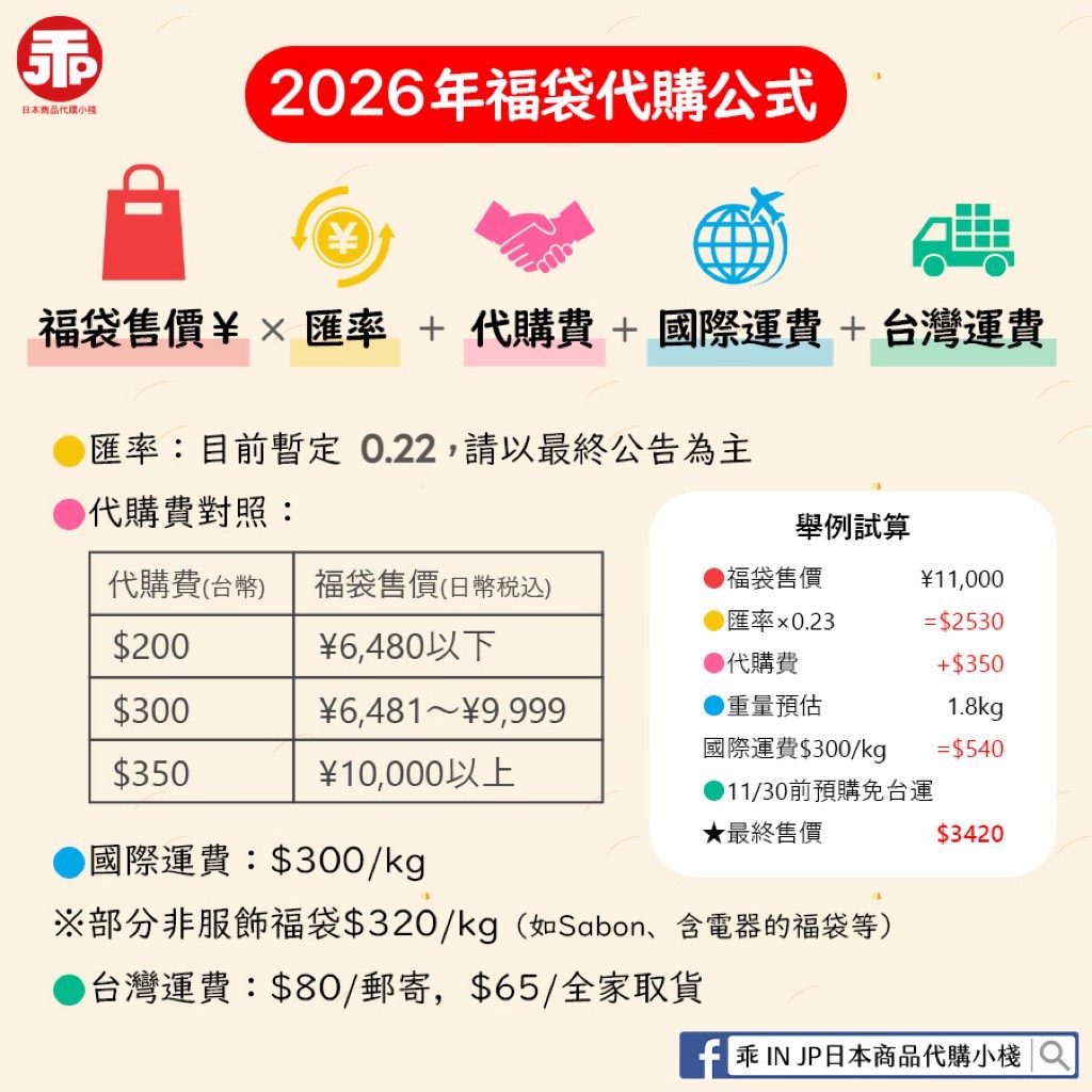 →例如:某福袋 ¥6,480×0.23+代購費200+國際運費估(1公斤×300)+預購免台運=$1990