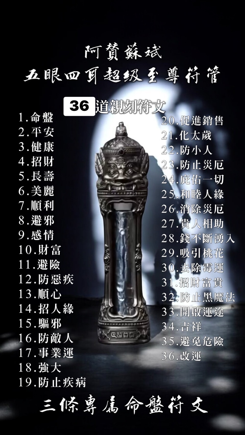 36大加持能量 + 三條命盤專屬符文,為你量身打造命運之路。無論你想避邪、招財、旺桃花、轉運、促事業或化解太歲,這款最高等級版本都能為你開啟全方位護佑能量,財運、人緣、健康、貴人運全面升級。