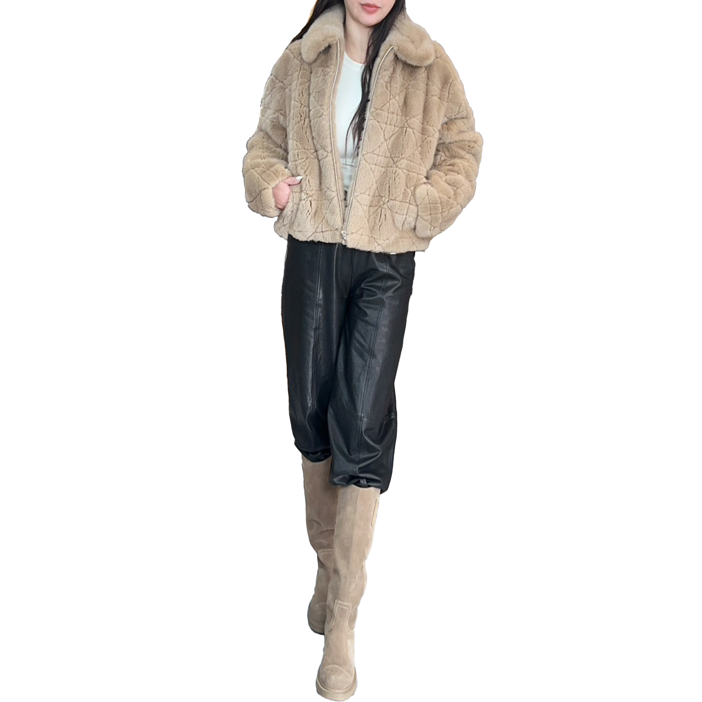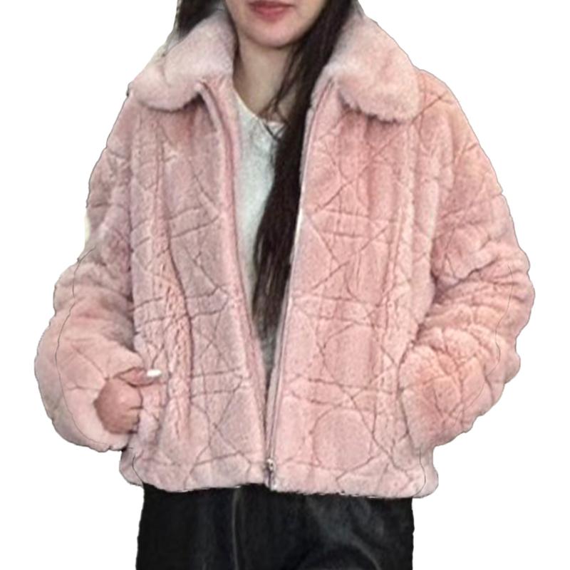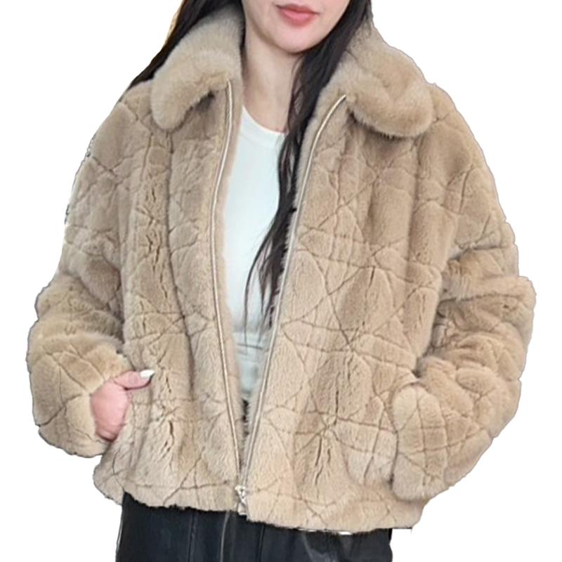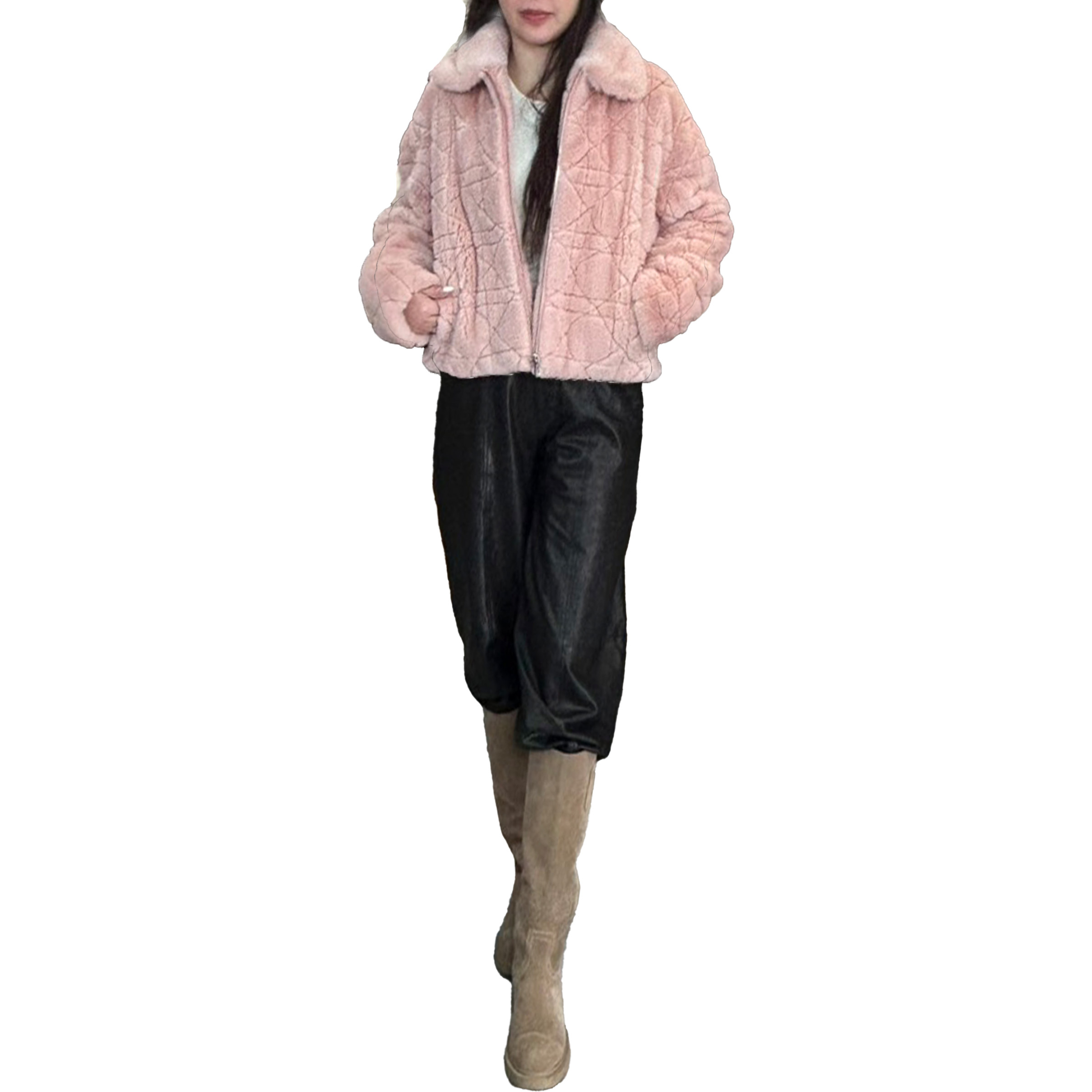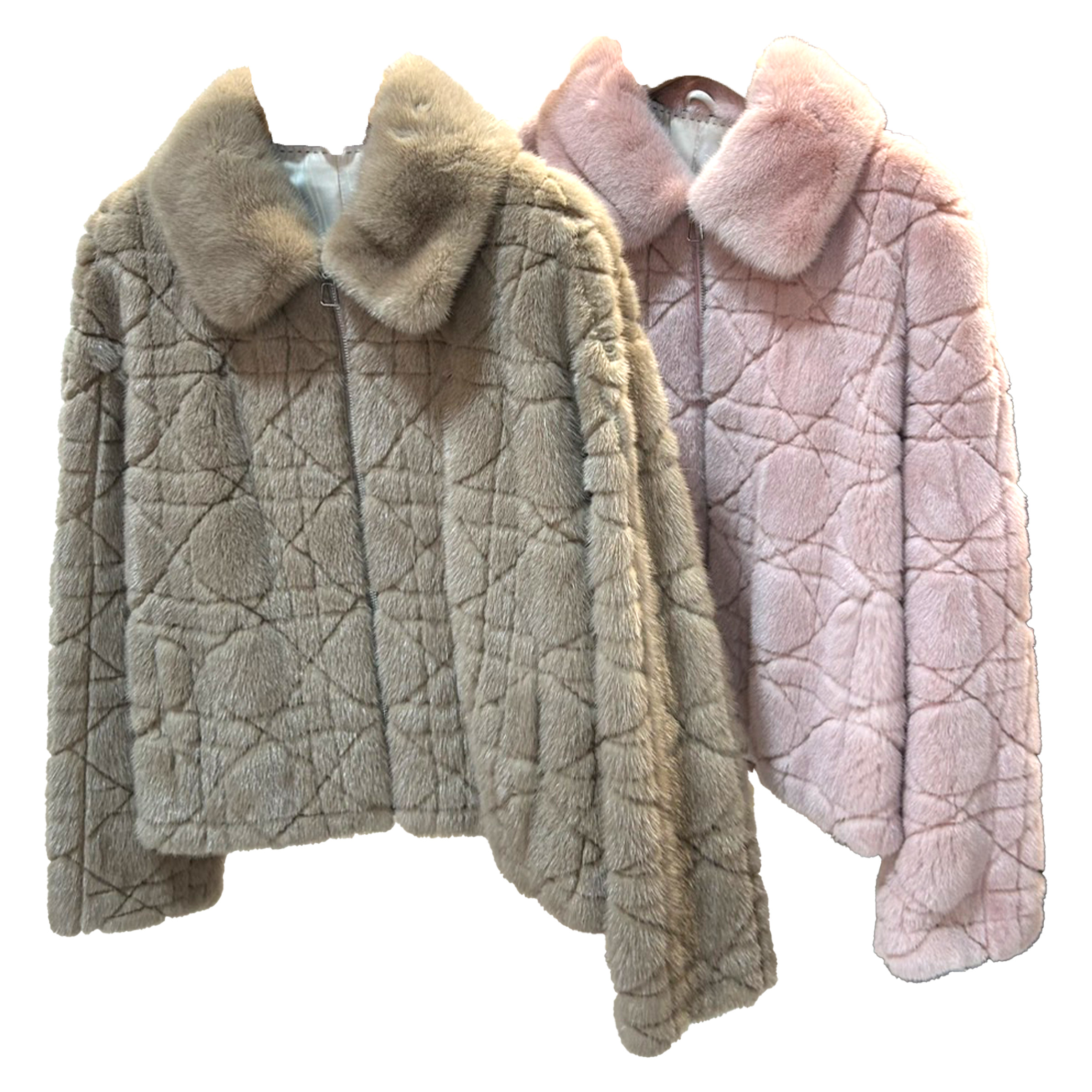 F065-格紋翻領貂毛外套-粉/杏【F落肩胸52長56】原價69800 福利價49800