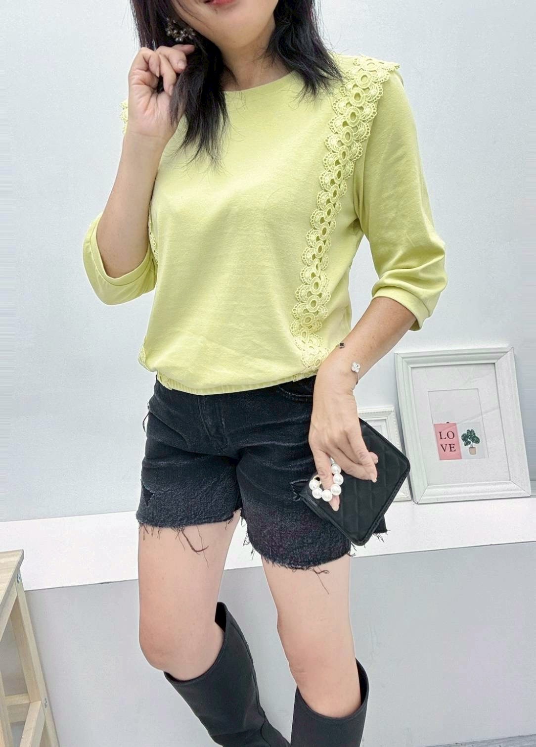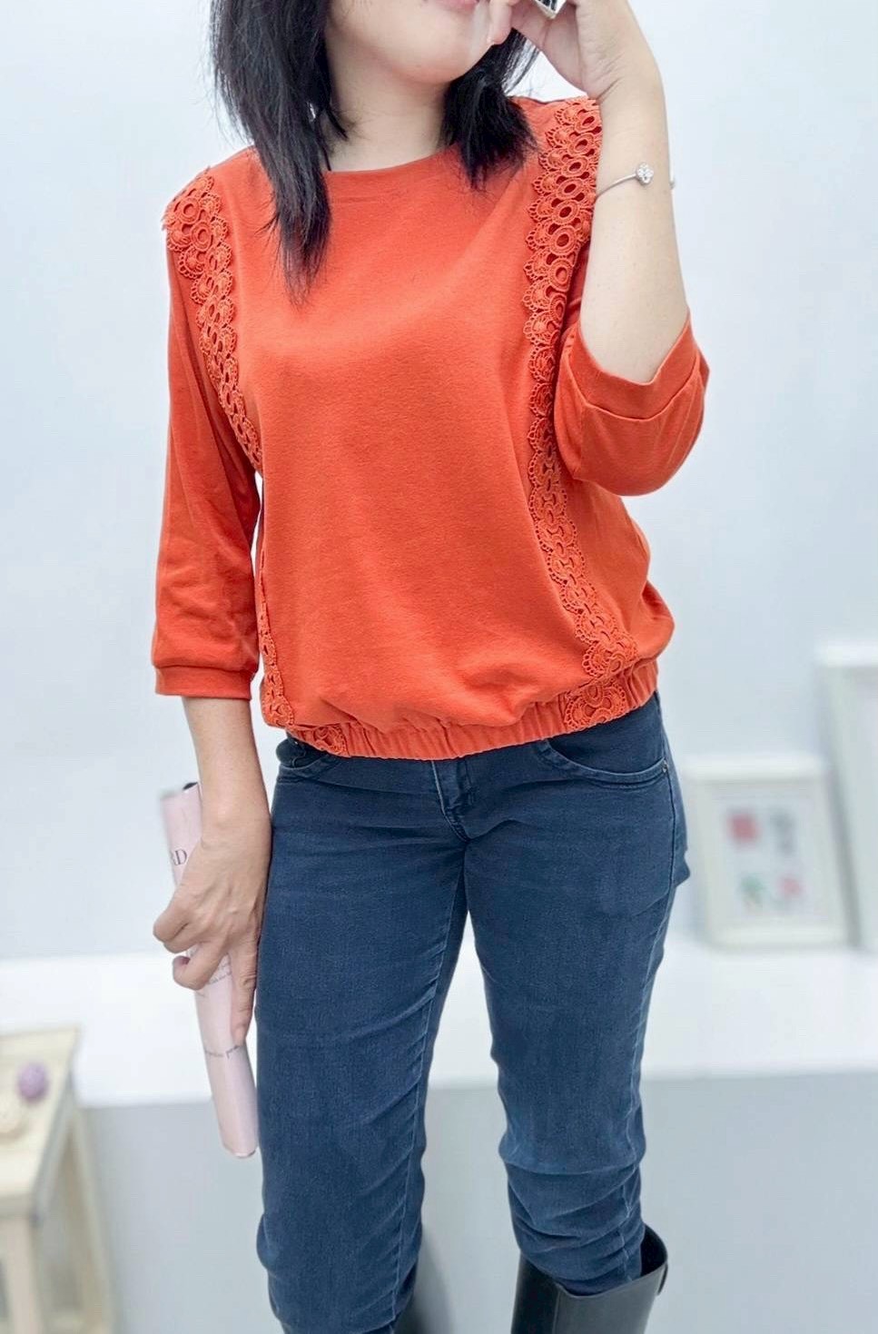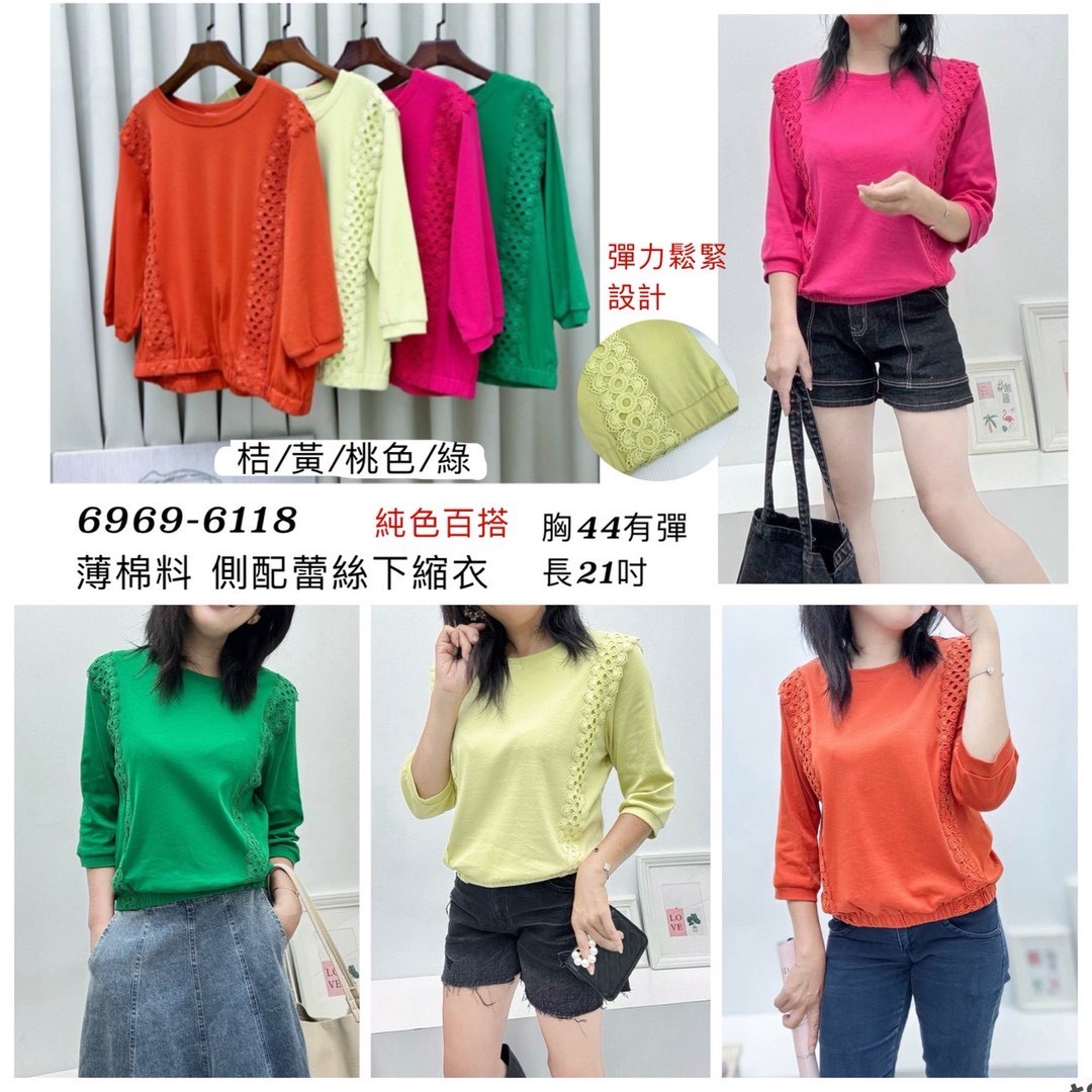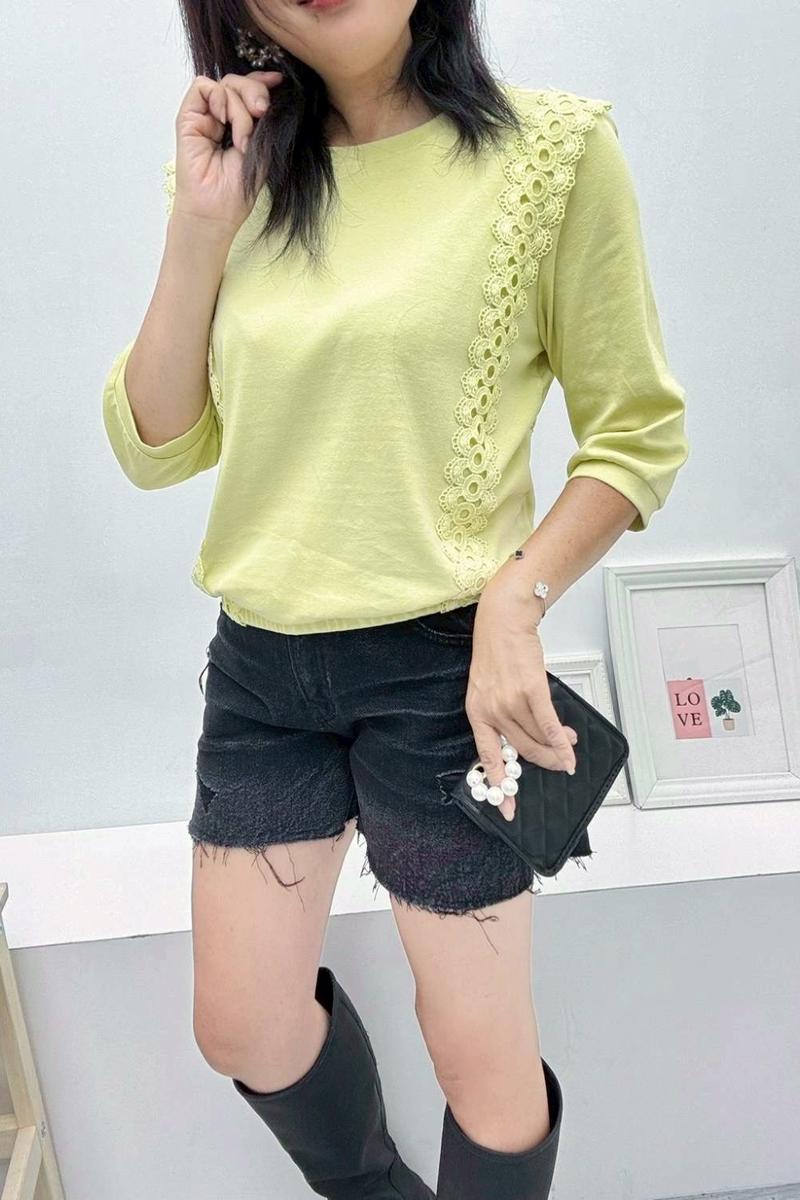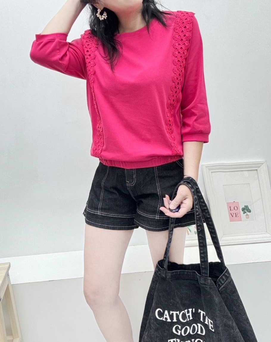 💕質感雕花蕾絲拼接🌼簡約中多了女人味~💛側身雕花蕾絲拼接,甜美又修飾💚 下擺微收設計,拉出比例好輕鬆💛 彈性棉料,舒適親膚不悶熱💚七分袖設計,修飾手臂超顯瘦!