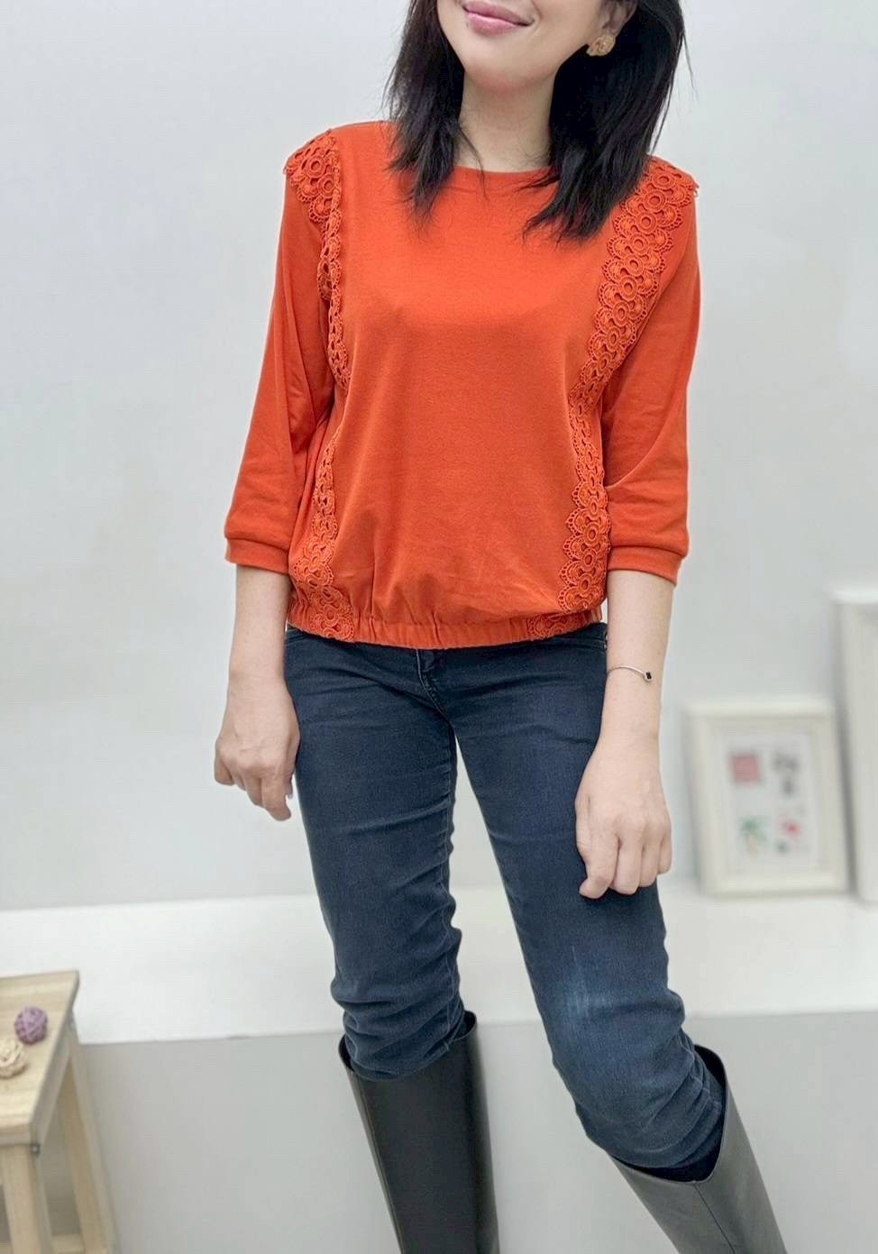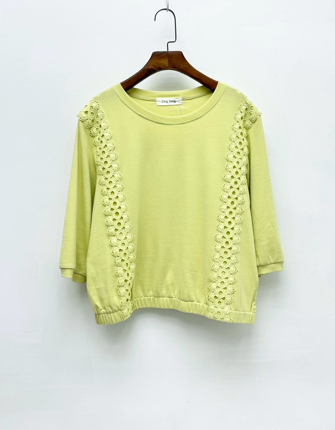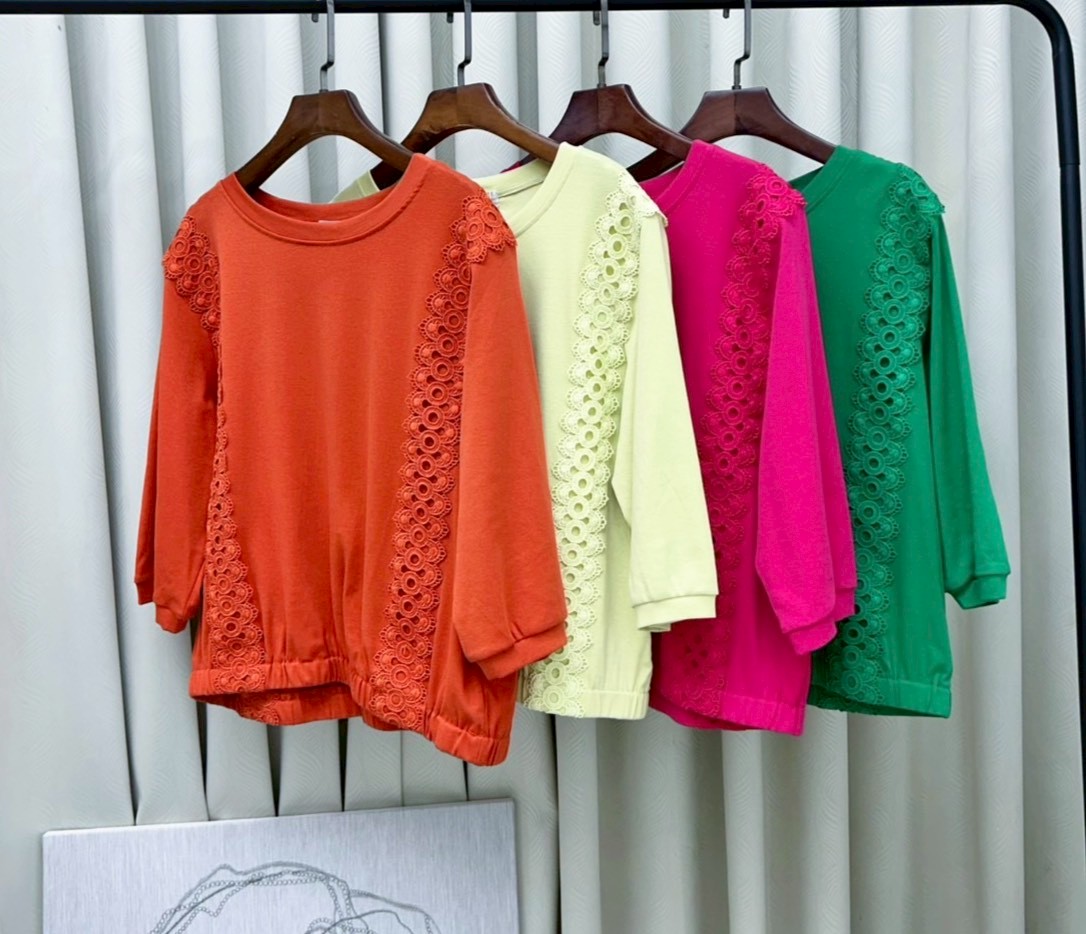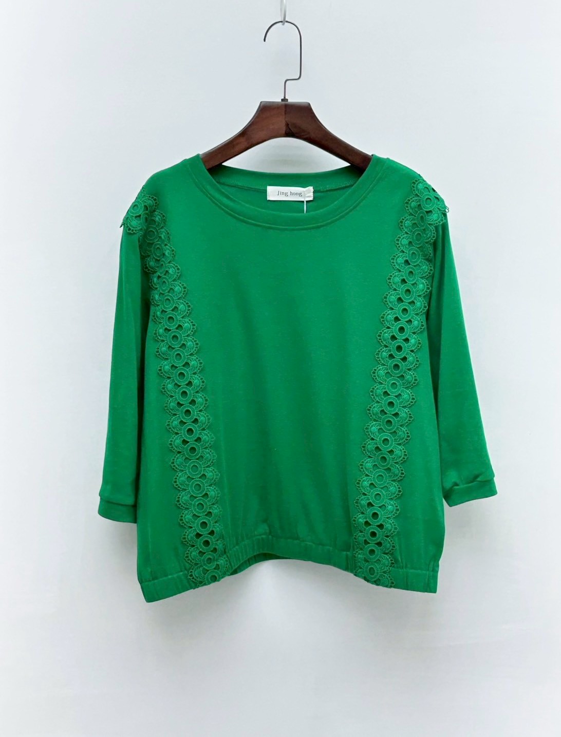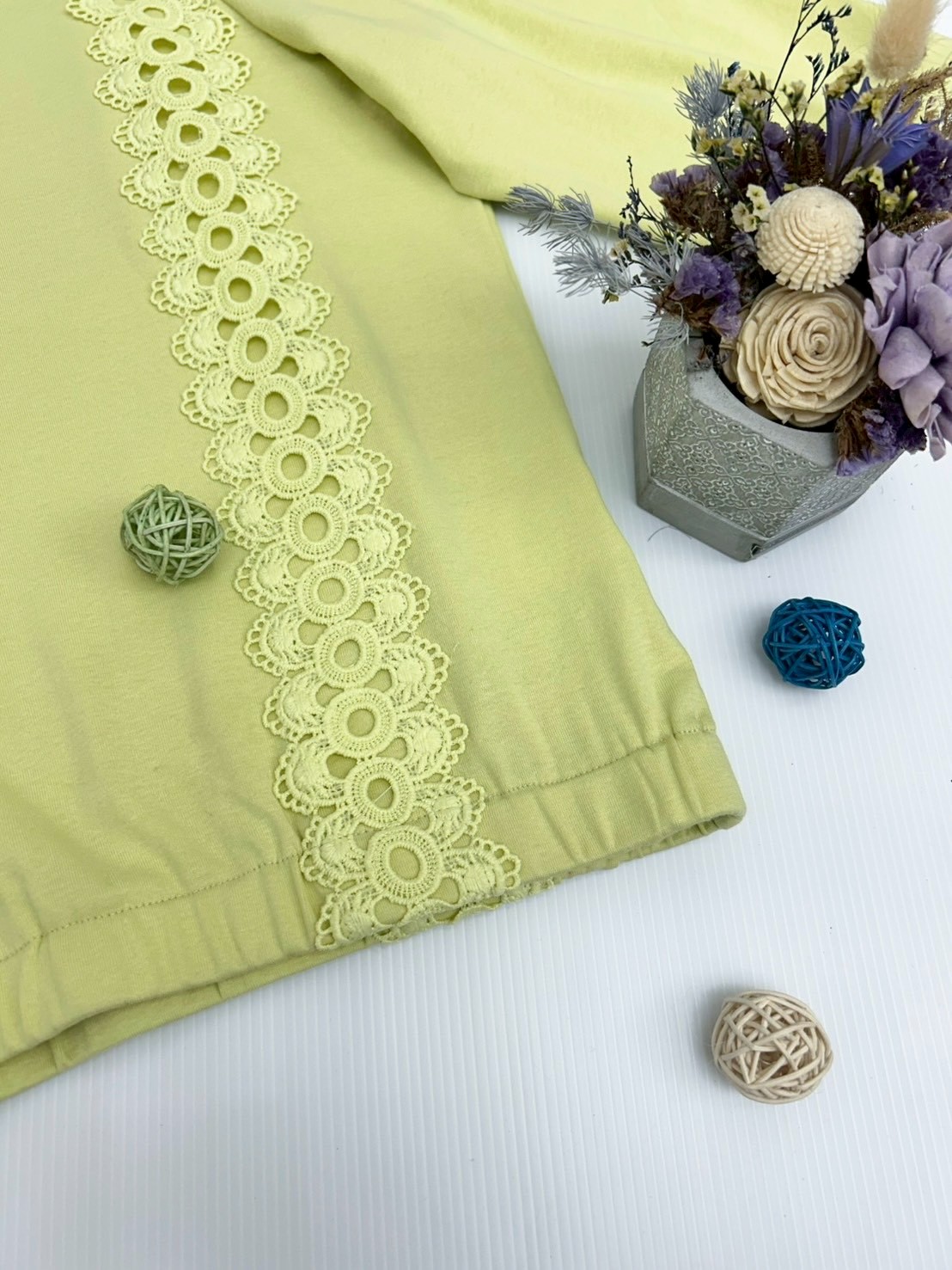 💕質感雕花蕾絲拼接🌼簡約中多了女人味~💛側身雕花蕾絲拼接,甜美又修飾💚 下擺微收設計,拉出比例好輕鬆💛 彈性棉料,舒適親膚不悶熱💚七分袖設計,修飾手臂超顯瘦!