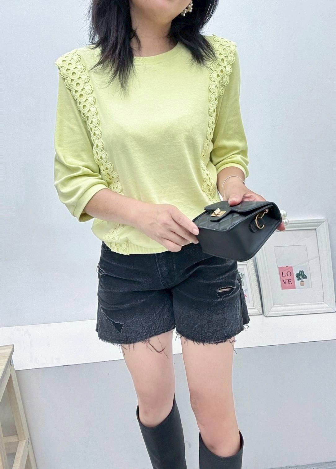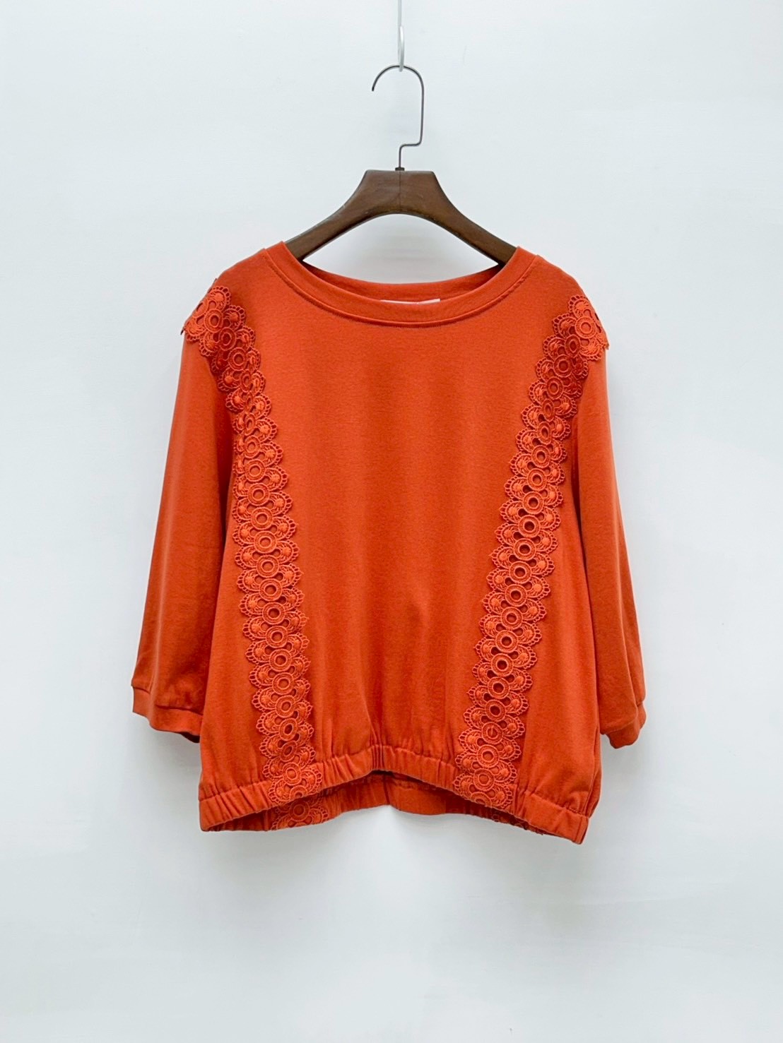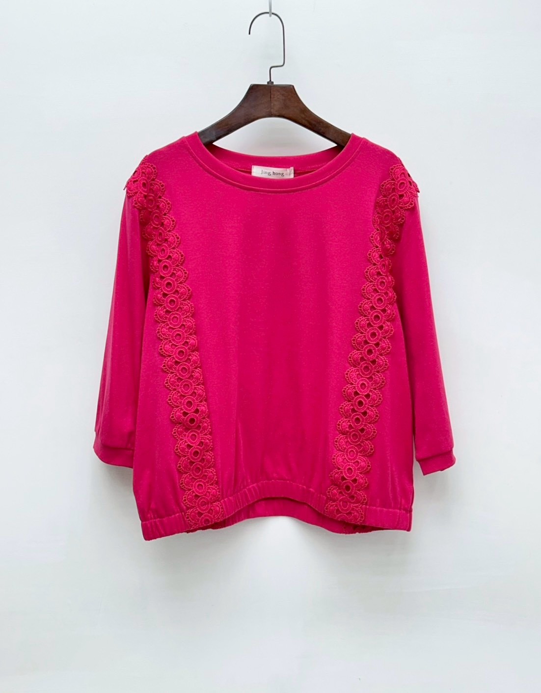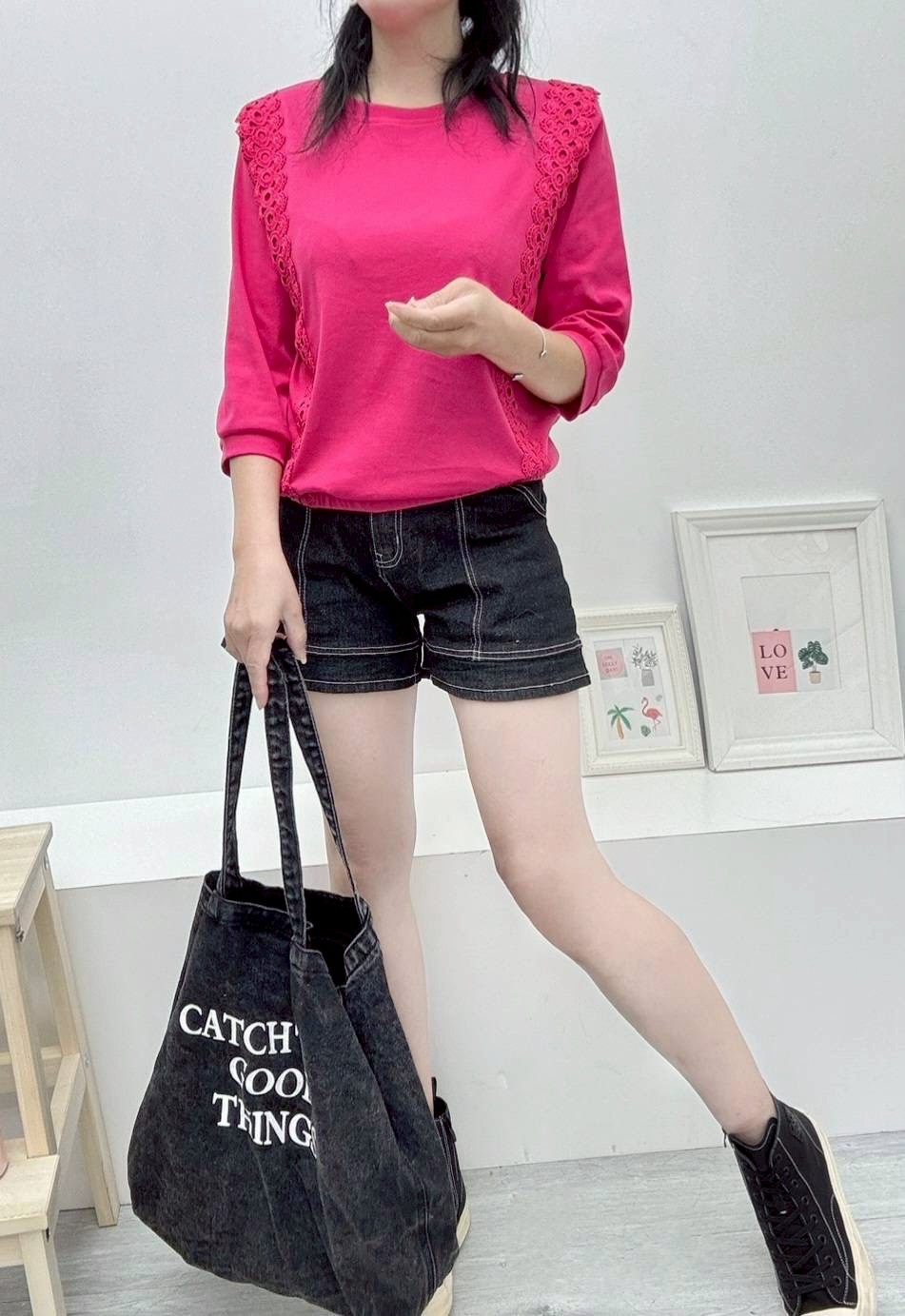💕質感雕花蕾絲拼接🌼簡約中多了女人味~💛側身雕花蕾絲拼接,甜美又修飾💚 下擺微收設計,拉出比例好輕鬆💛 彈性棉料,舒適親膚不悶熱💚七分袖設計,修飾手臂超顯瘦!