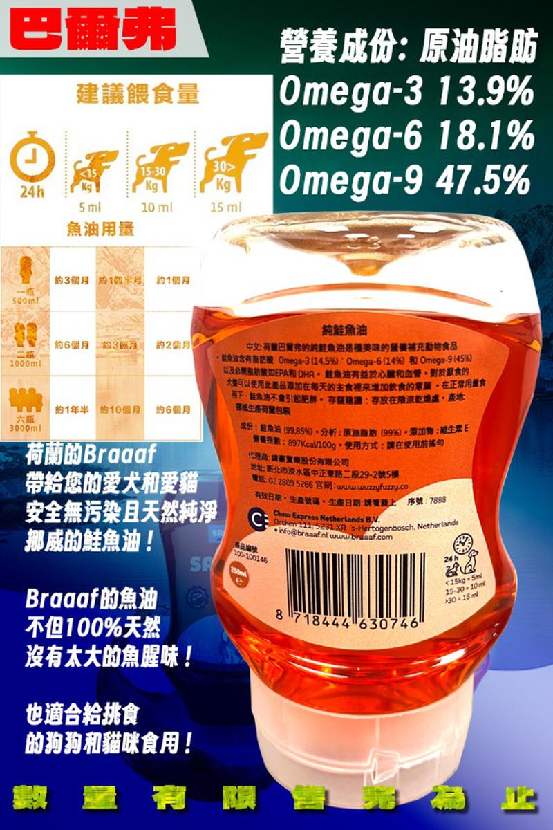 荷蘭 Braaaf 巴爾弗 100%純天然挪威鮭魚油250ml 犬貓適用 寵物魚油