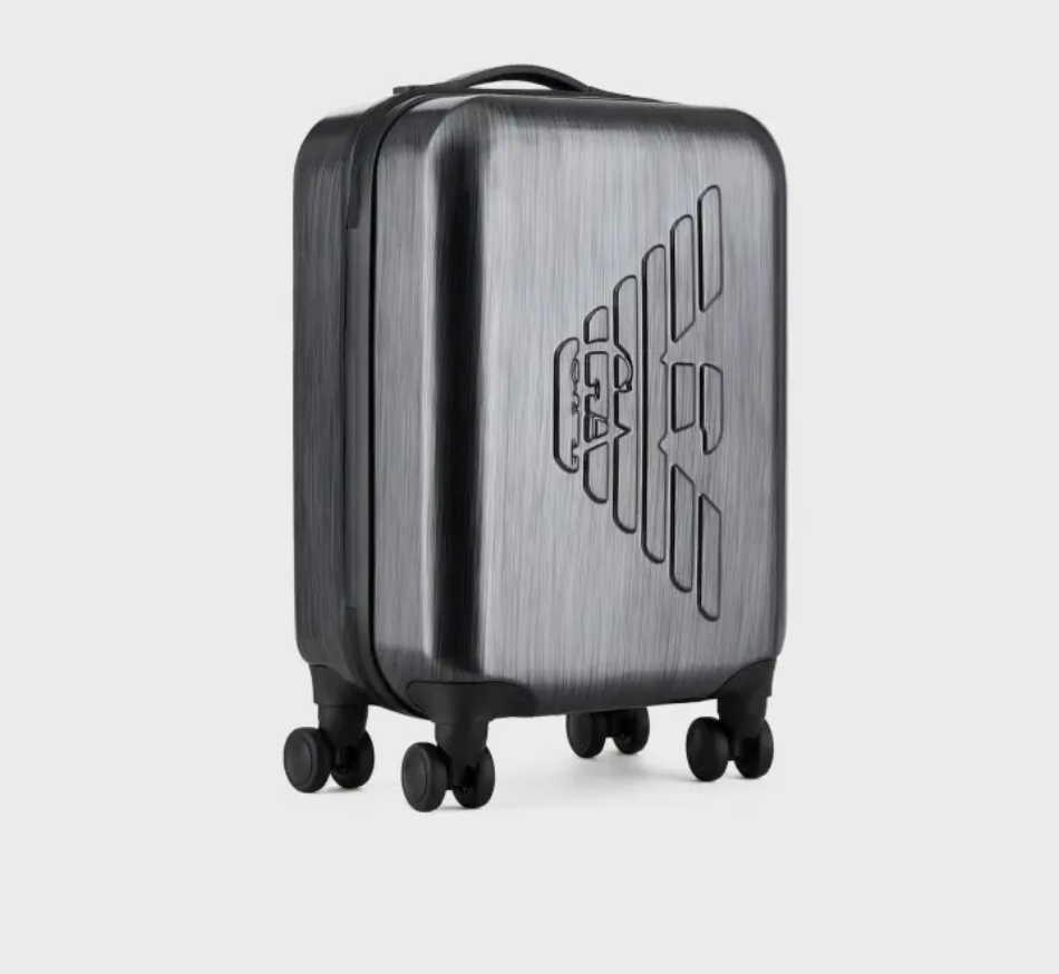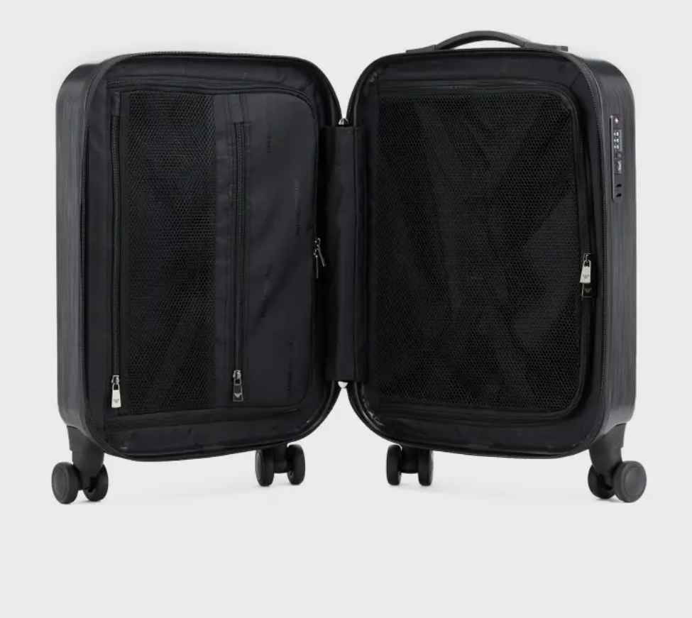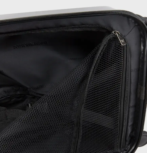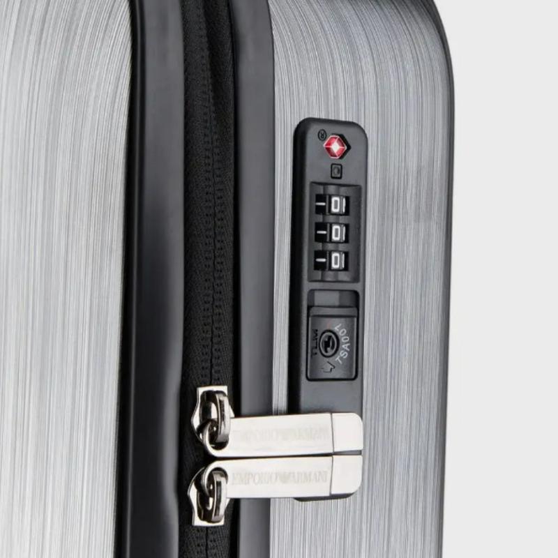 辦理登機、起飛、時差。旅行箱配件需要兼具時尚和實用性。EMPORIO ARMANI 在二者間找到了平衡。這款拉桿包採用輕盈耐用的特殊材料,特色在於海關鎖設計。拉手可伸縮,內部隔層配有拉鍊。