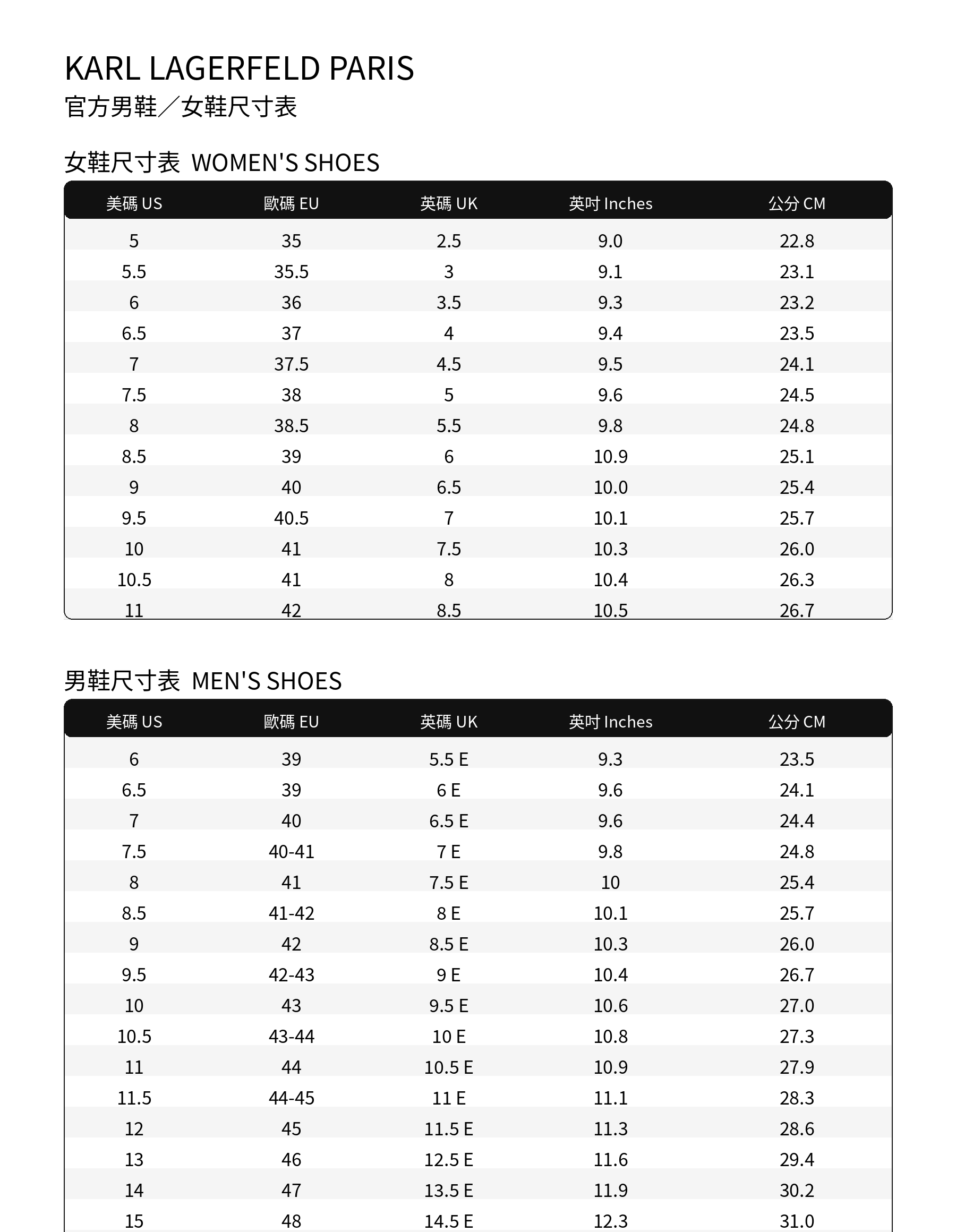 (非賣品) 卡爾老佛爺尺寸表 (點選詳細介紹瀏覽)