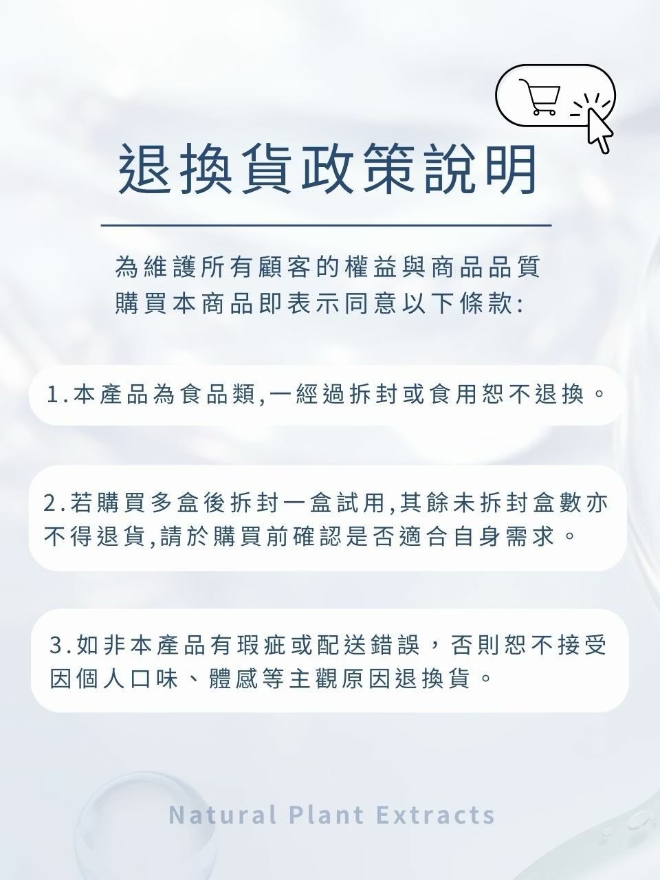 (1-3)依據消費者保護法規定,貼身物品(枕頭、內衣、內褲、襪子、棉被、毯子、保暖貼身衣褲...等)/美容儀器/保養品/彩妝品/食品皆屬個人衛生用品,商品如拆封檢查試用後再次出售,會有影響衛生之虞,故拆封使用/試用後非全新狀態的商品不提供七天鑑賞期,訂購即代表同意購物規則。