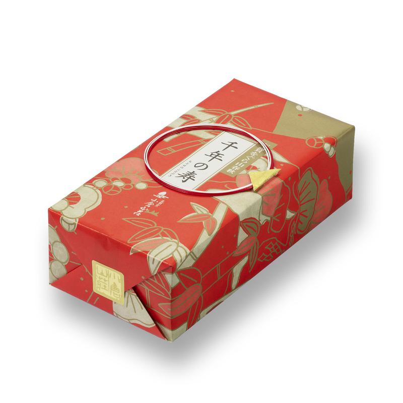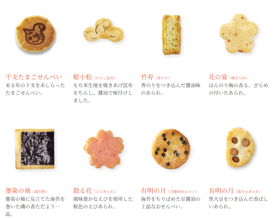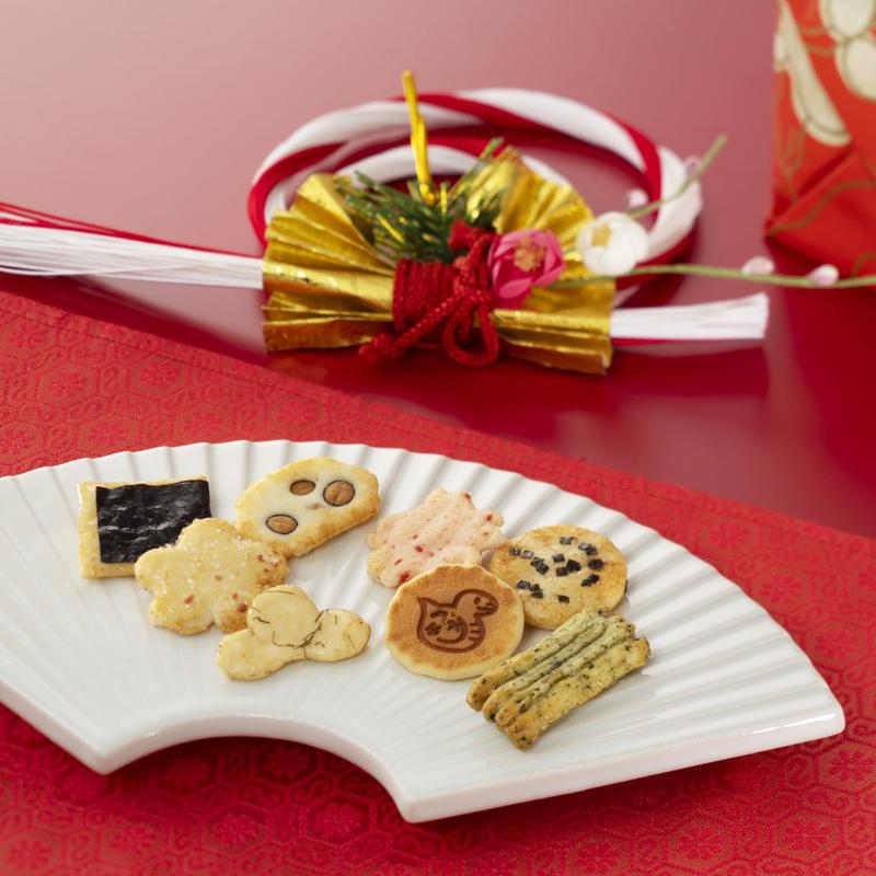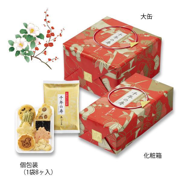 以吉祥的“松竹梅”為主題,除了十二生肖裝飾的米果外,用蝦和海帶等吉祥食材製成的“千年壽”米果也適合特殊場合。為了祈求長壽一千年,我們把它裝在適合新年禮物的金袋子裡,並用松竹梅花、紅白水引的包裝紙裝飾。請隨意用於新年祝福和新年講義。