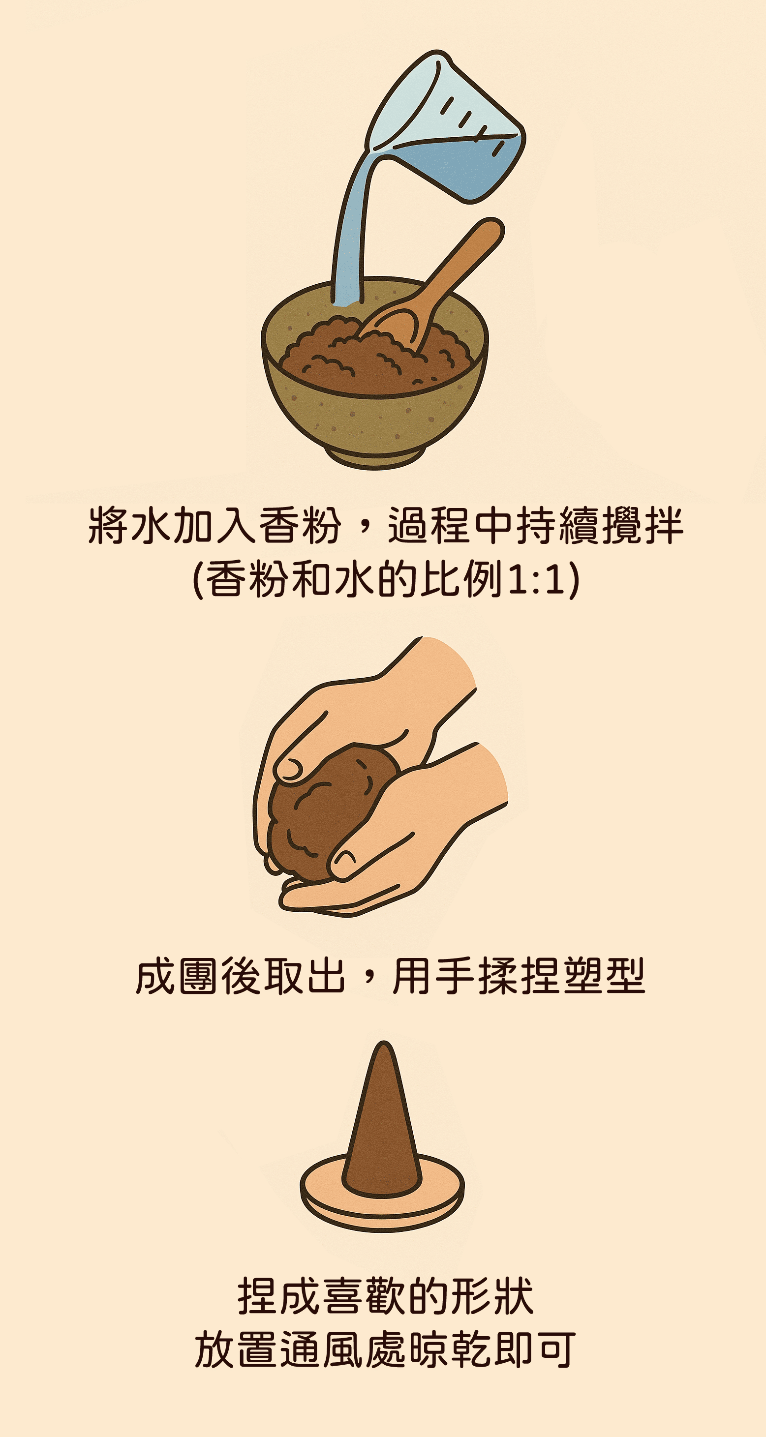 你可以搓成長條線香,也可以捏成圓餅狀,甚至壓模成喜歡的形狀(例如香椎、香塔)