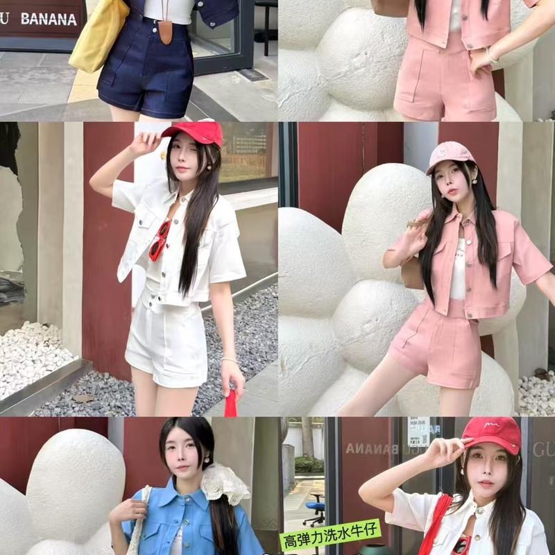 U985 翻領車線銀釦短袖上衣+雙釦雙大口袋短褲套裝(黑)(1899)(F)