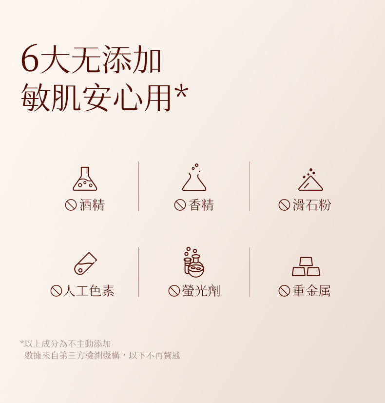 本款產品採用六無添加,只取肌膚友好成分,易敏感的膚質建議您收到產品後在耳後或手腕處進行敏感測試。