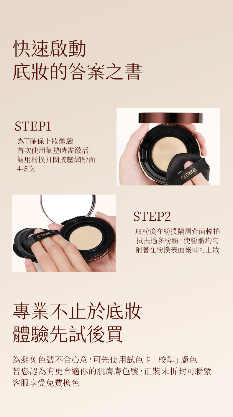 這款氣墊需要激活,為保證上妝體驗,首次使用時,請將粉撲打圈按壓網紗面 4-5 次完成激活後即可正常使用。