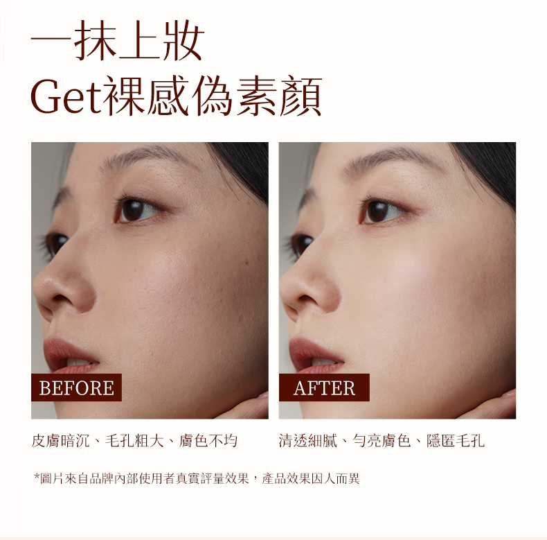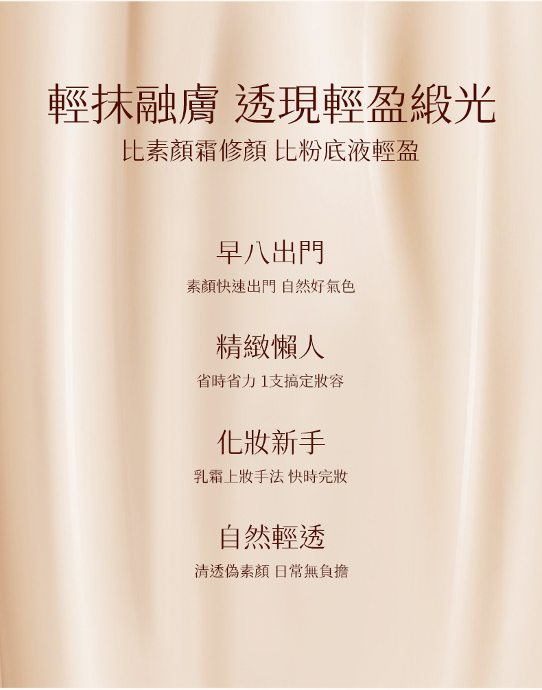 本品具有自然提亮的效果,上臉後能與膚色自然融合,不挑膚色不假白,打造偽素顏裸感妝容。