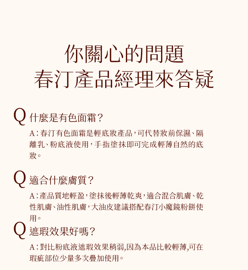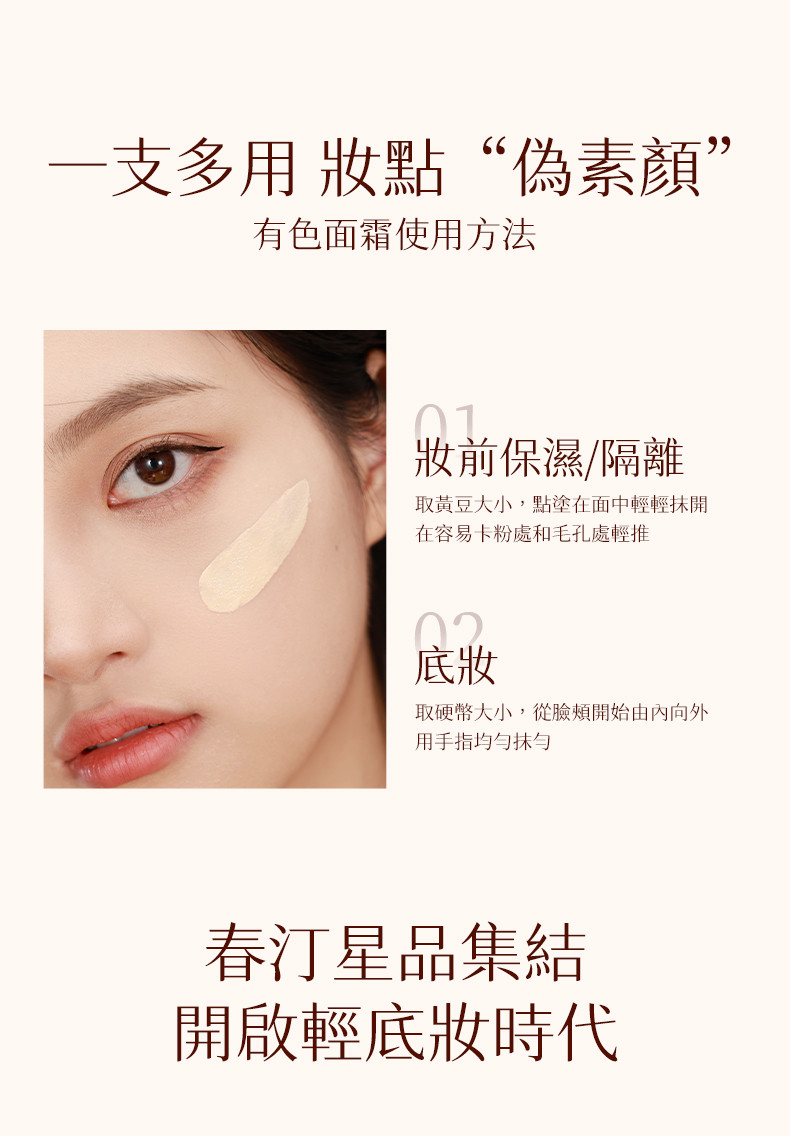 春汀有色面霜是一款輕底妝產品,可代替妝前保濕、隔離乳、粉底液使用,上妝的同時兼顧養膚,手指塗抹即可完成輕薄自然的底妝。 產品質地輕盈,塗抹後輕薄乾爽,適合混合肌膚、乾性肌膚、油性肌膚,大油皮建議搭配春汀小魔鏡粉餅使用。
