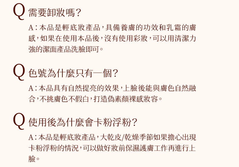 本品是輕底妝產品,大乾皮/乾燥季節如果擔心出現卡粉浮粉的情況,可以做好妝前保濕護膚工作再進行上臉。