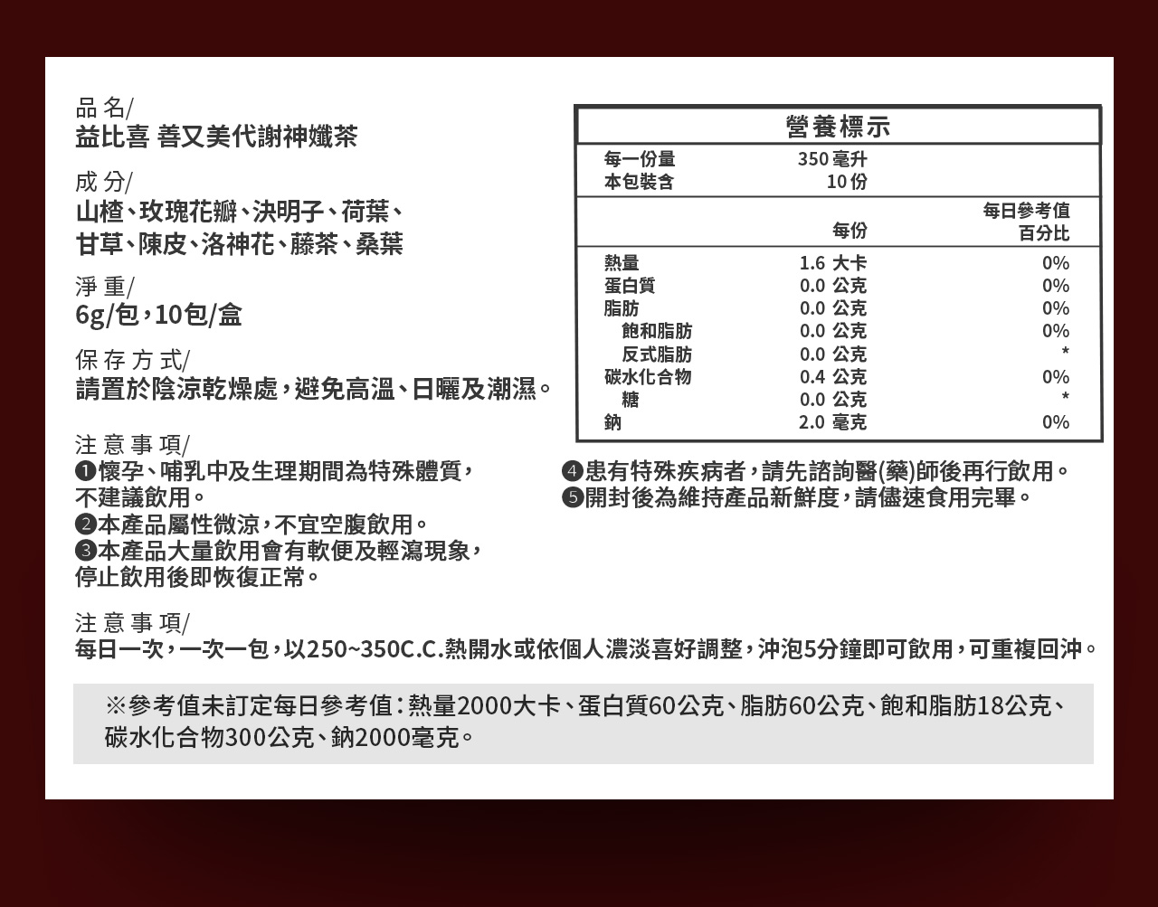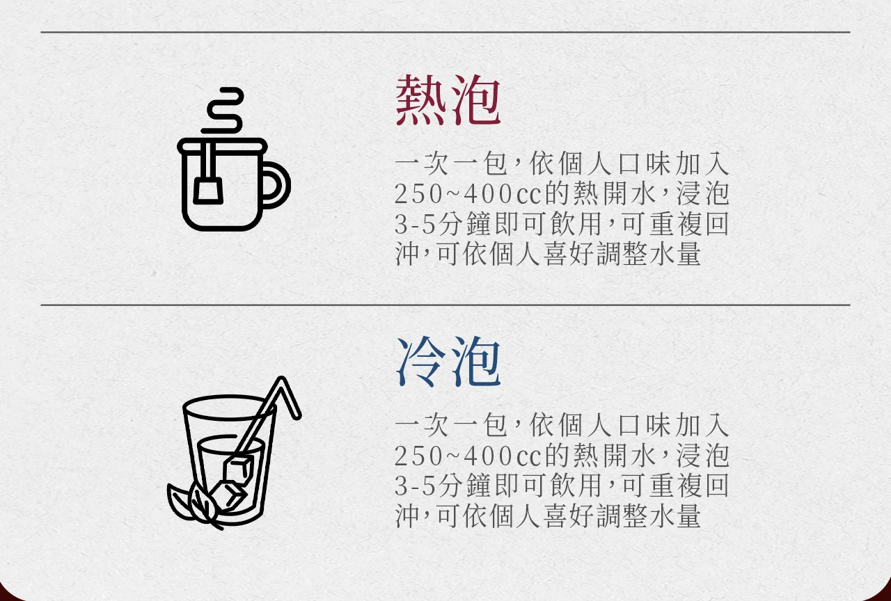 ➤食用方法:每日一次,一次一包,以250~350c.c熱開水或依個人濃淡喜好調整,沖泡5分鐘即可飲用,可重複回沖。