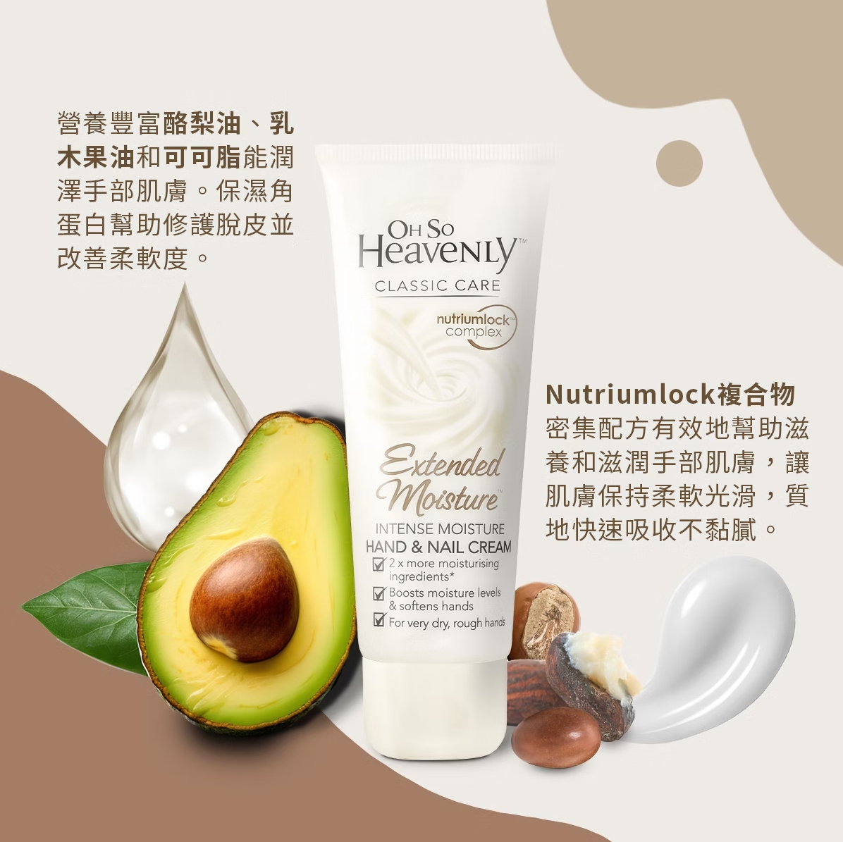 🔸營養豐富酪梨油、乳木果油和可可脂能潤澤手部肌膚