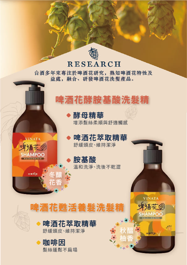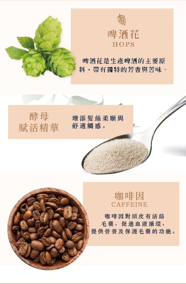 啤酒花萃取精華:淨化頭皮環境,維持清爽平衡。