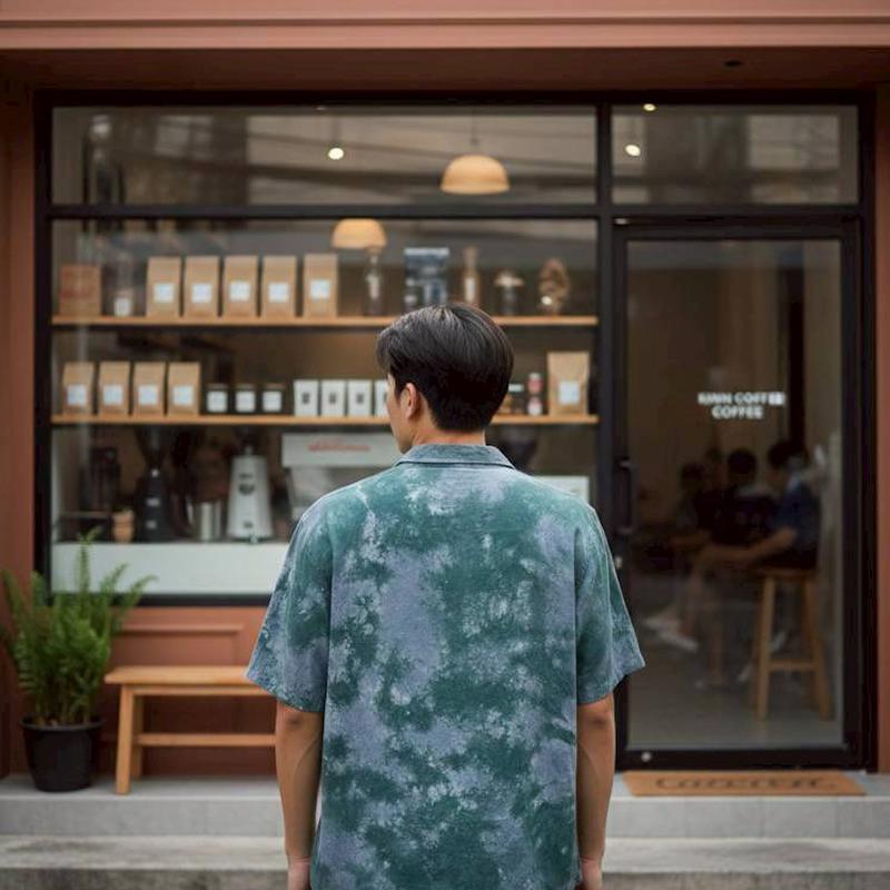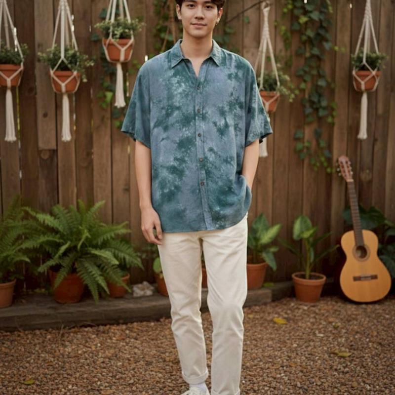 BP22-冰絲超帥折領排扣短袖上衣(男女可穿)-綠灰潑漆#3232/關鍵字:7232/