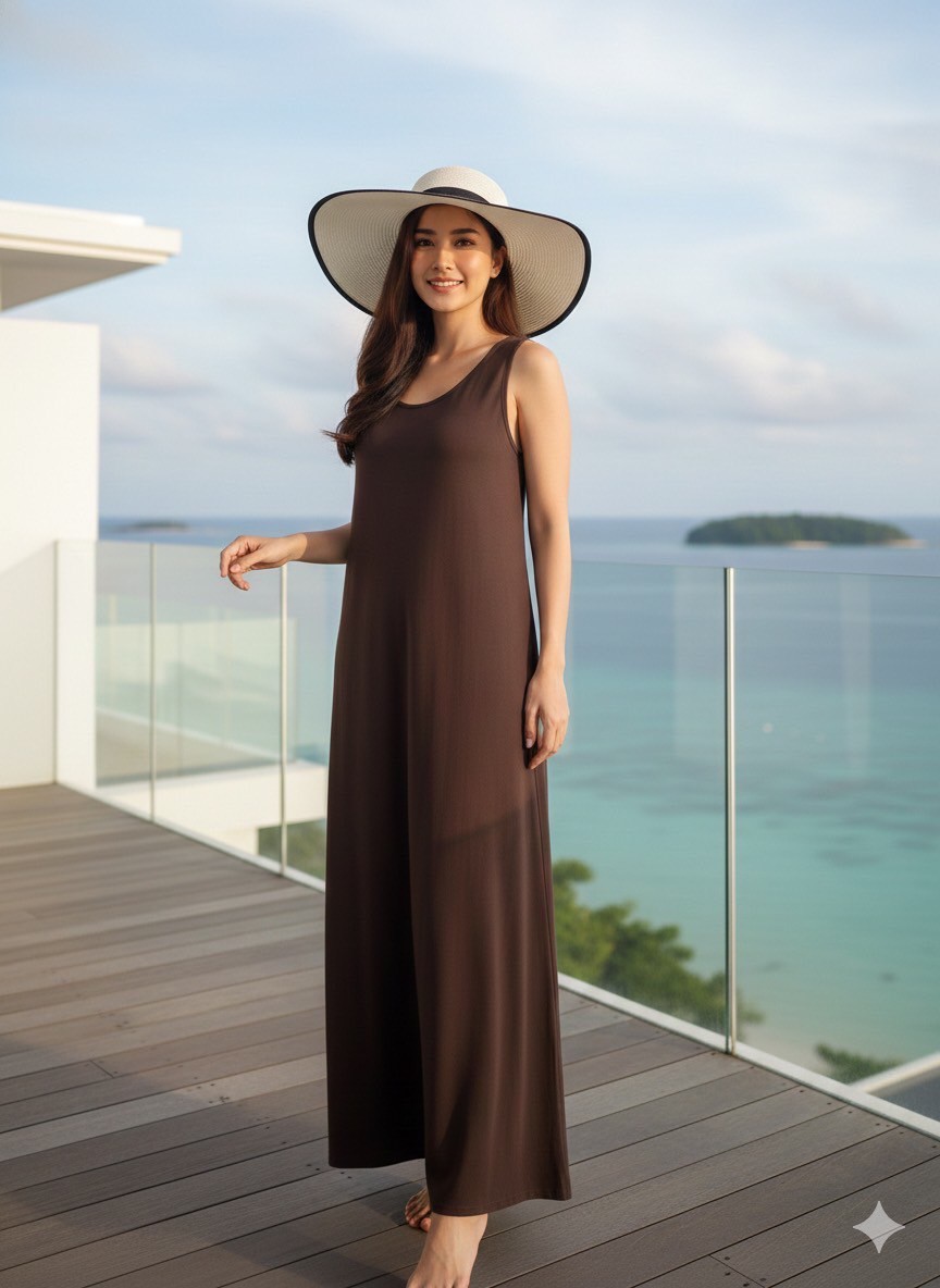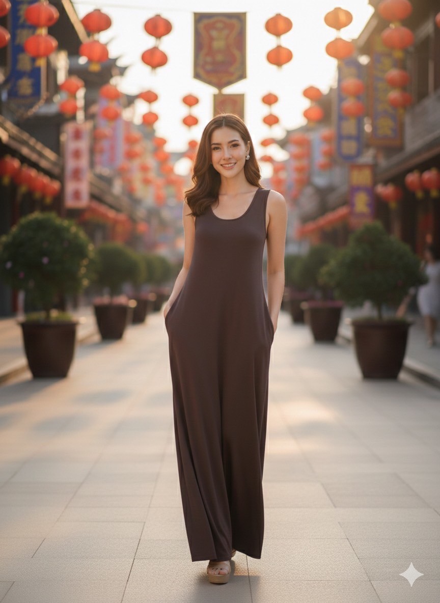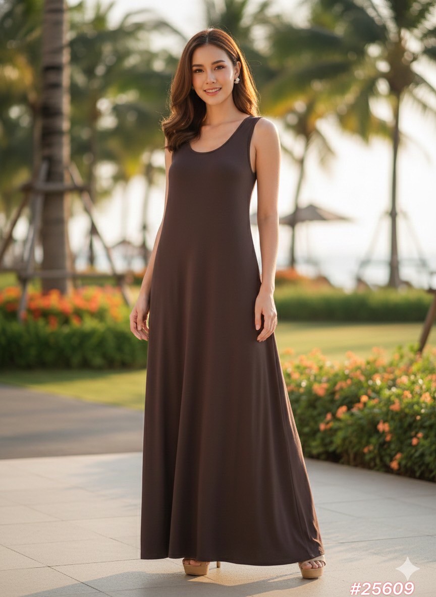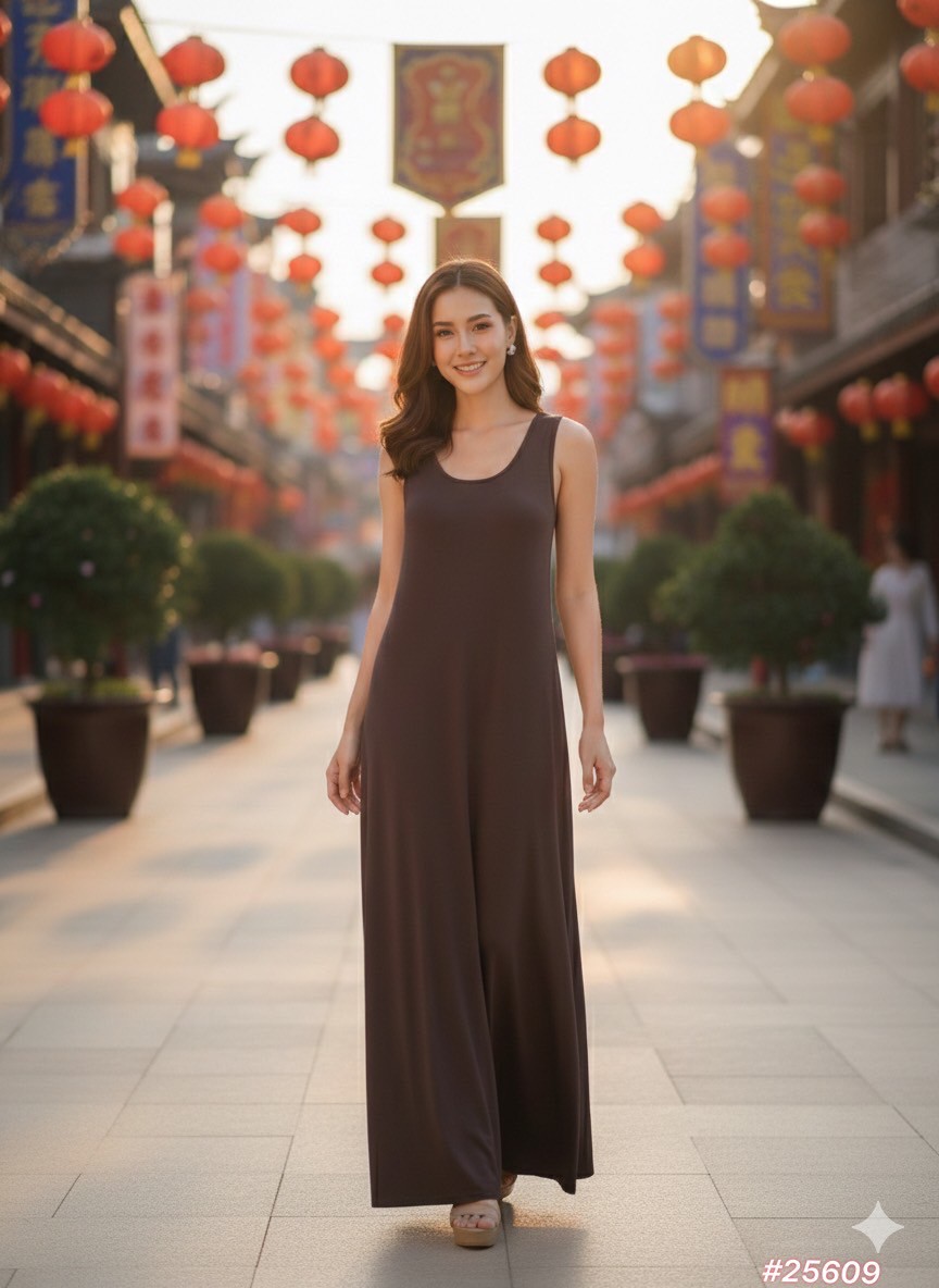 彈性棉長無袖洋裝-深咖啡色(有口袋)#25609/關鍵字:1184/