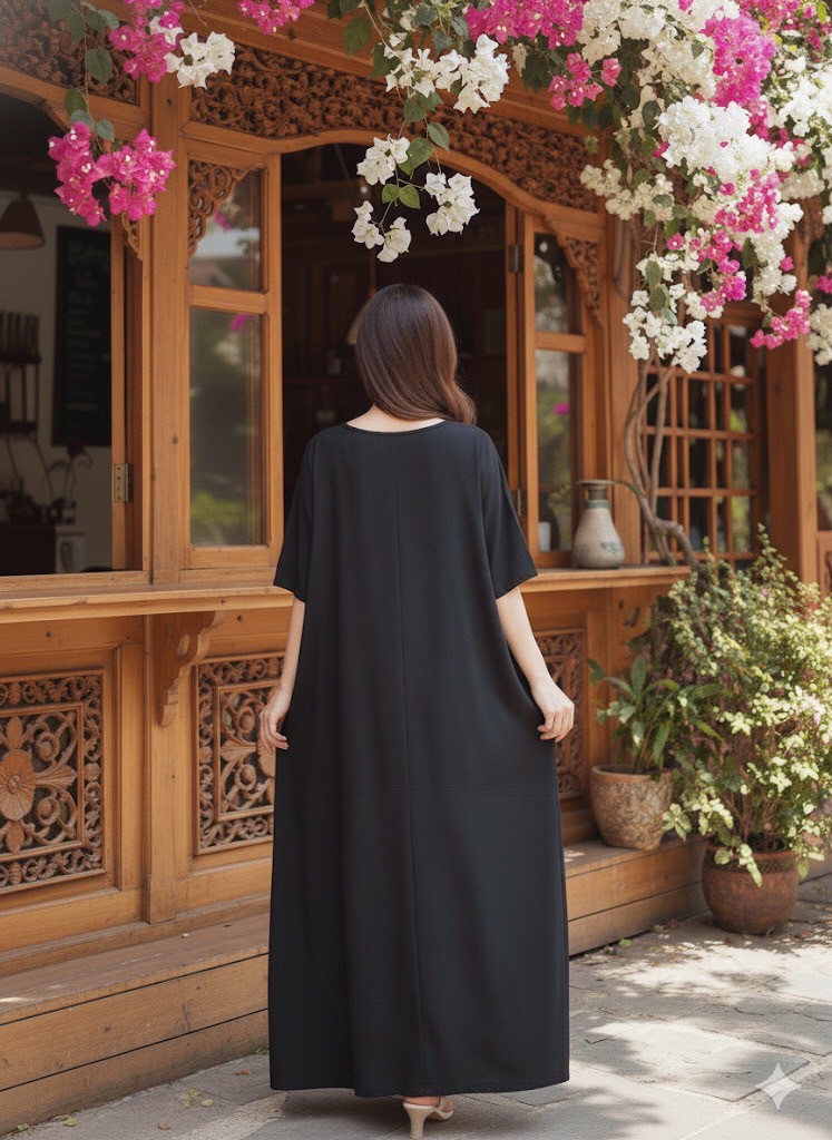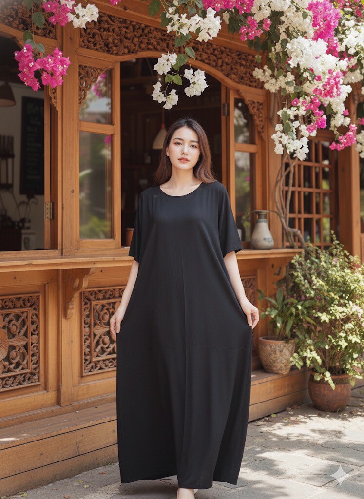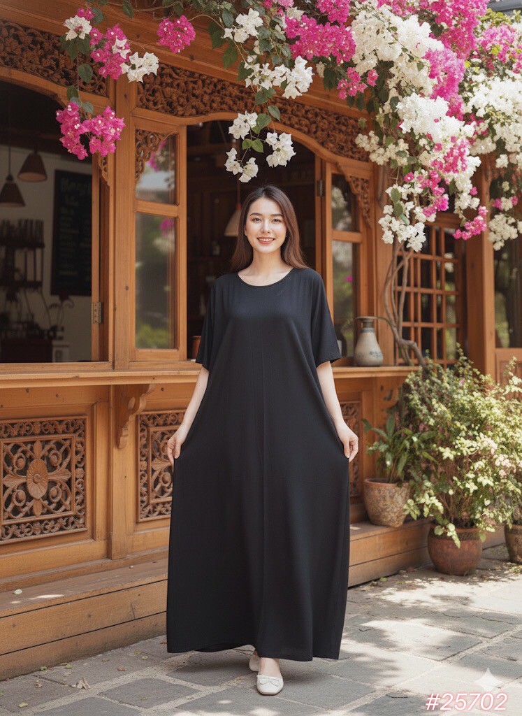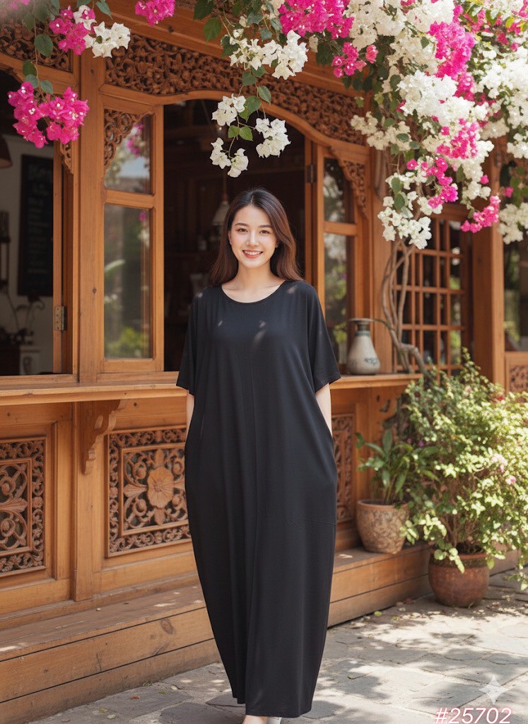 彈性棉飛鼠寬版短袖大長洋-全黑<大全碼>#25702/關鍵字:6953/