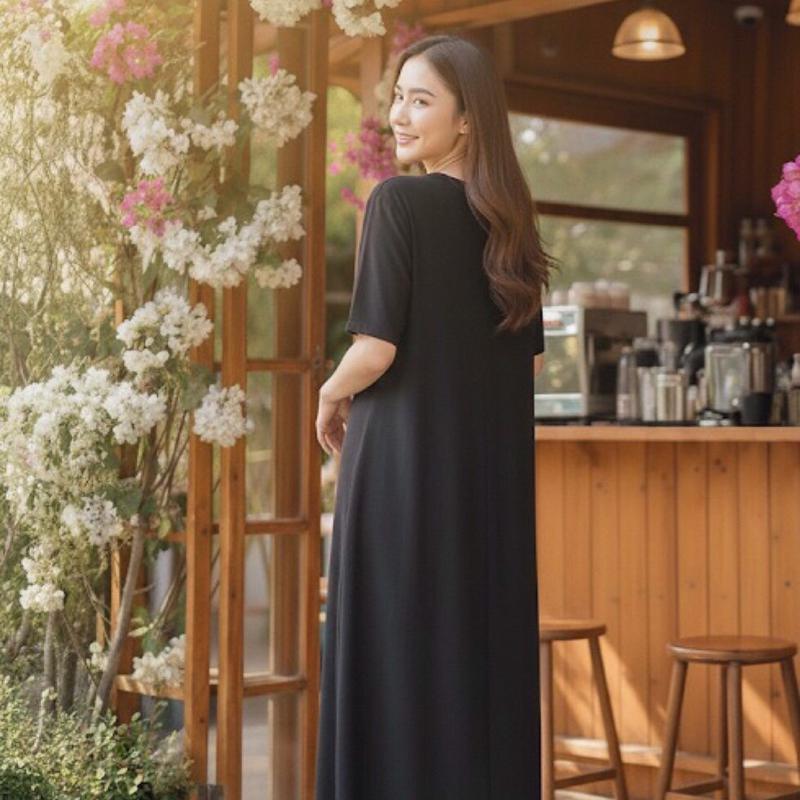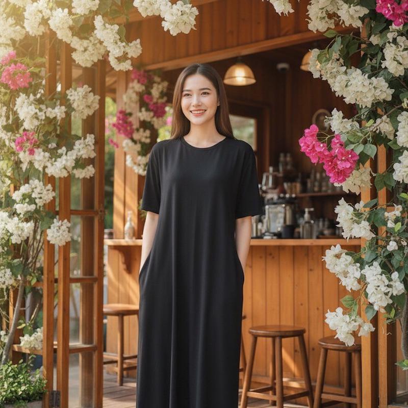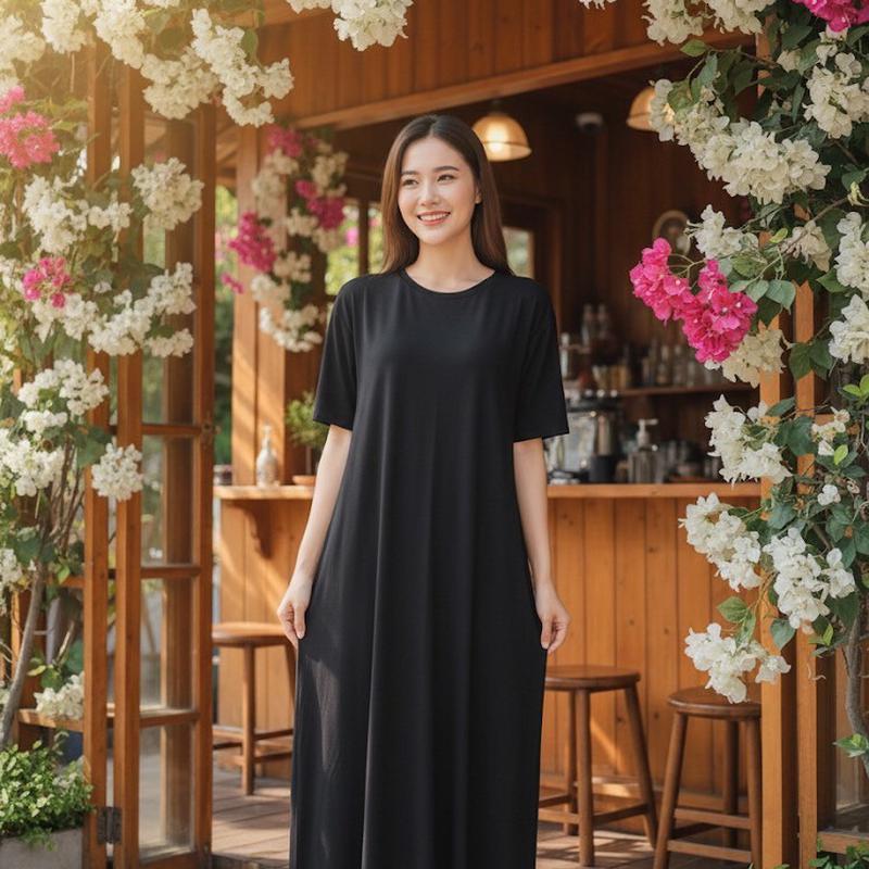 彈性棉短袖大長洋-全黑<全碼> #25714/關鍵字:1767/
