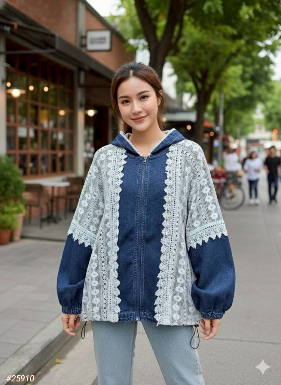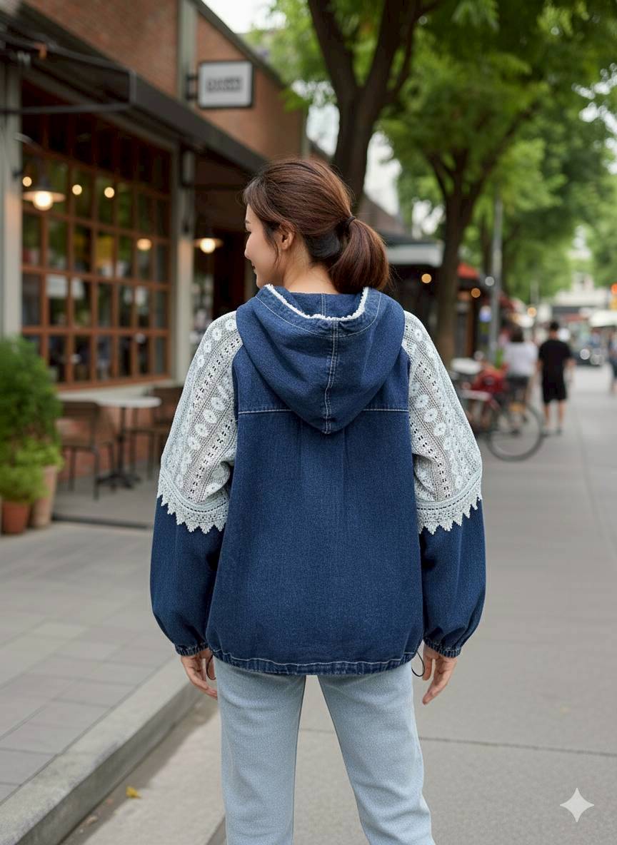 <無印感穿搭>蕾絲拼接連帽外套|丹寧藍#25910/關鍵字:2585/
