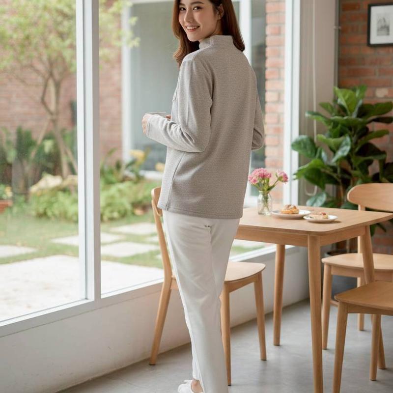 採用柔軟小磨毛布料,觸感溫潤親膚,保暖又透氣。布料具彈性、垂墜自然,穿著舒適不顯厚重。