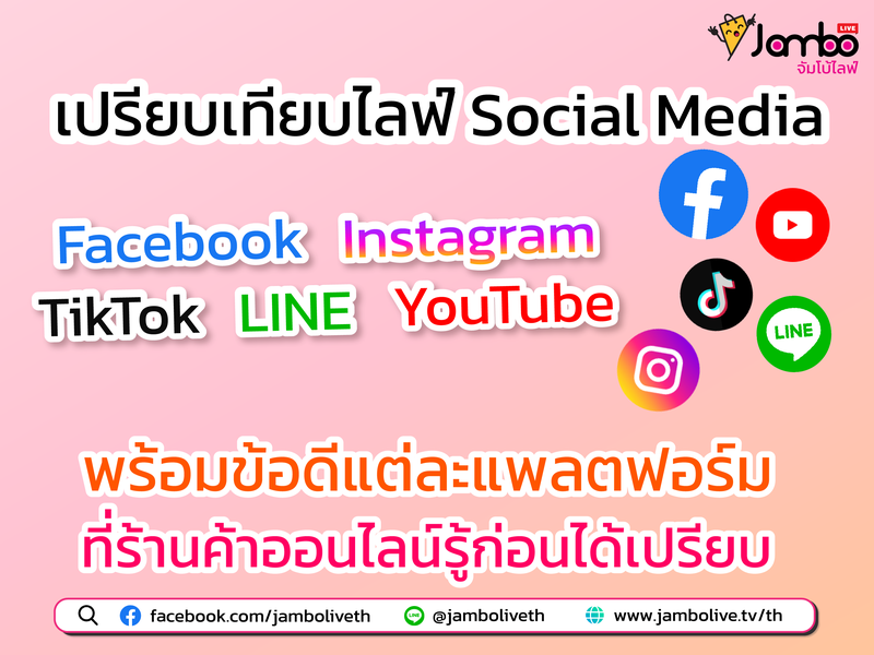 ในบทความนี้จัมโบ้ไลฟ์จะมาสรุปจุดเด่นของ Live Commerce บนแพลตฟอร์มยอดนิยม เช่น Facebook, YouTube, TikTok, Instagram, และ LINE ว่าจะมีความแตกต่างกันอย่างไรบ้าง และแต่ละแพลตฟอร์ม เหมาะกับสินค้าหรือบริการประเภทไหน